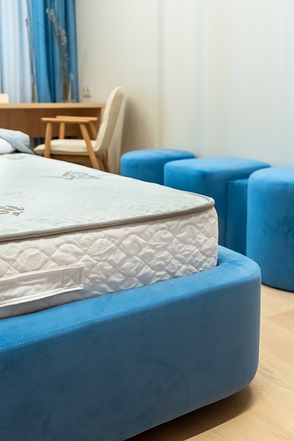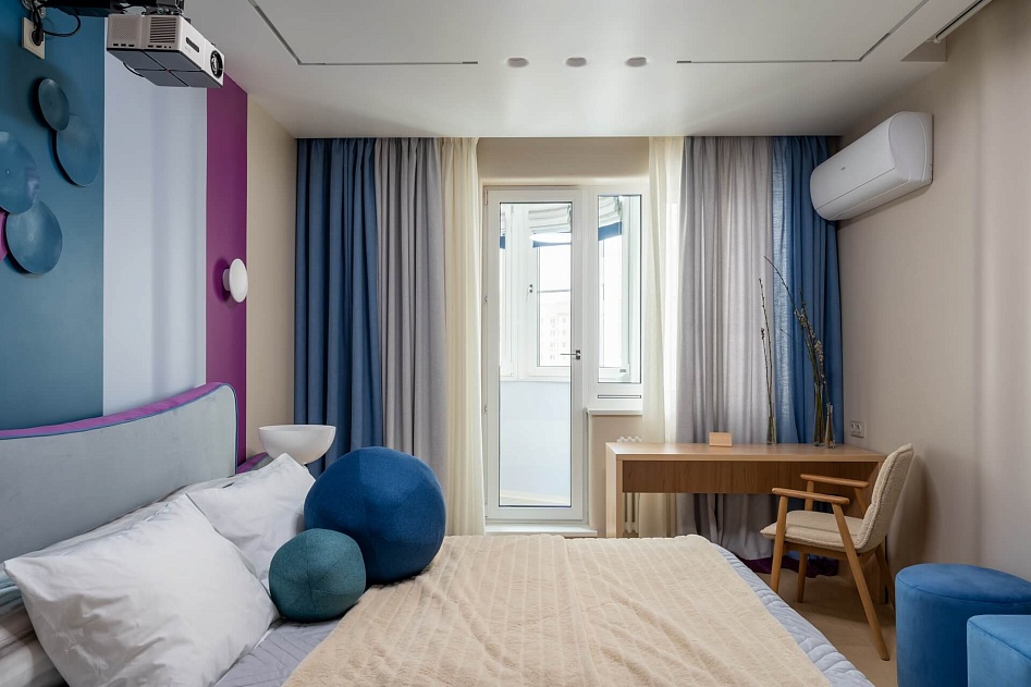 Детали интерьера бережно, но ненавязчиво напоминают о том,что герои любят спорт (через волнообразную, плавную геометрию интерьера – отсыл к волнам или элементы интерьера в виде подушек-шаров, круглых ножек прикроватных тумб или пуфика перед кроватью, напоминающих про футбол)