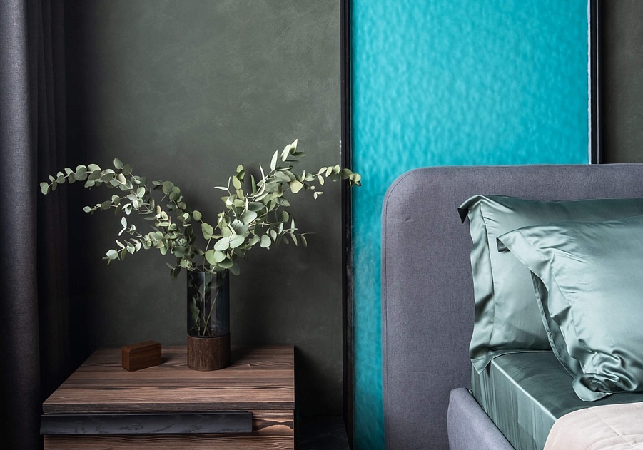 Вода. За изголовьем кровати разместили стеклянную панель с подсветкой. Вдохновившись озером Севан, с его чистейшей лазурной водой, придумали такой декоративный элемент, который одновременно будет выступать в роли ночника.