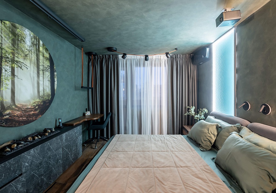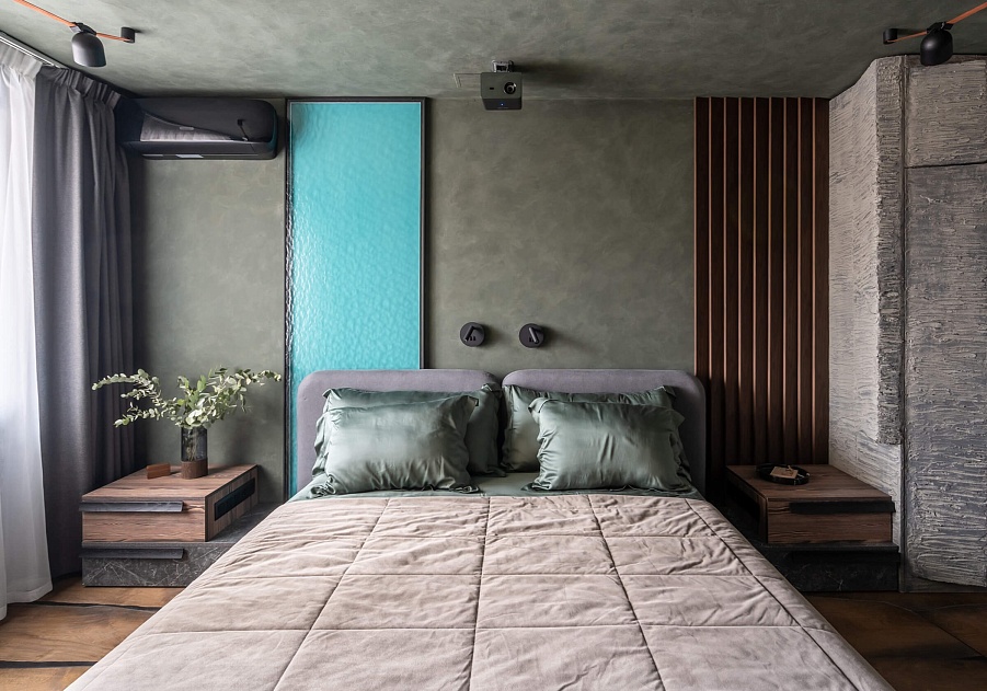 Поэтому основная идея, которая прослеживается в концепции проекта, это горы. Пространство спальни было условно разделено на 3 зоны. Центральная зона с кроватью, напротив нее – зона кабинета, и при входе – зона хранения одежды. При этом в одной комнате отражены все четыре стихии: