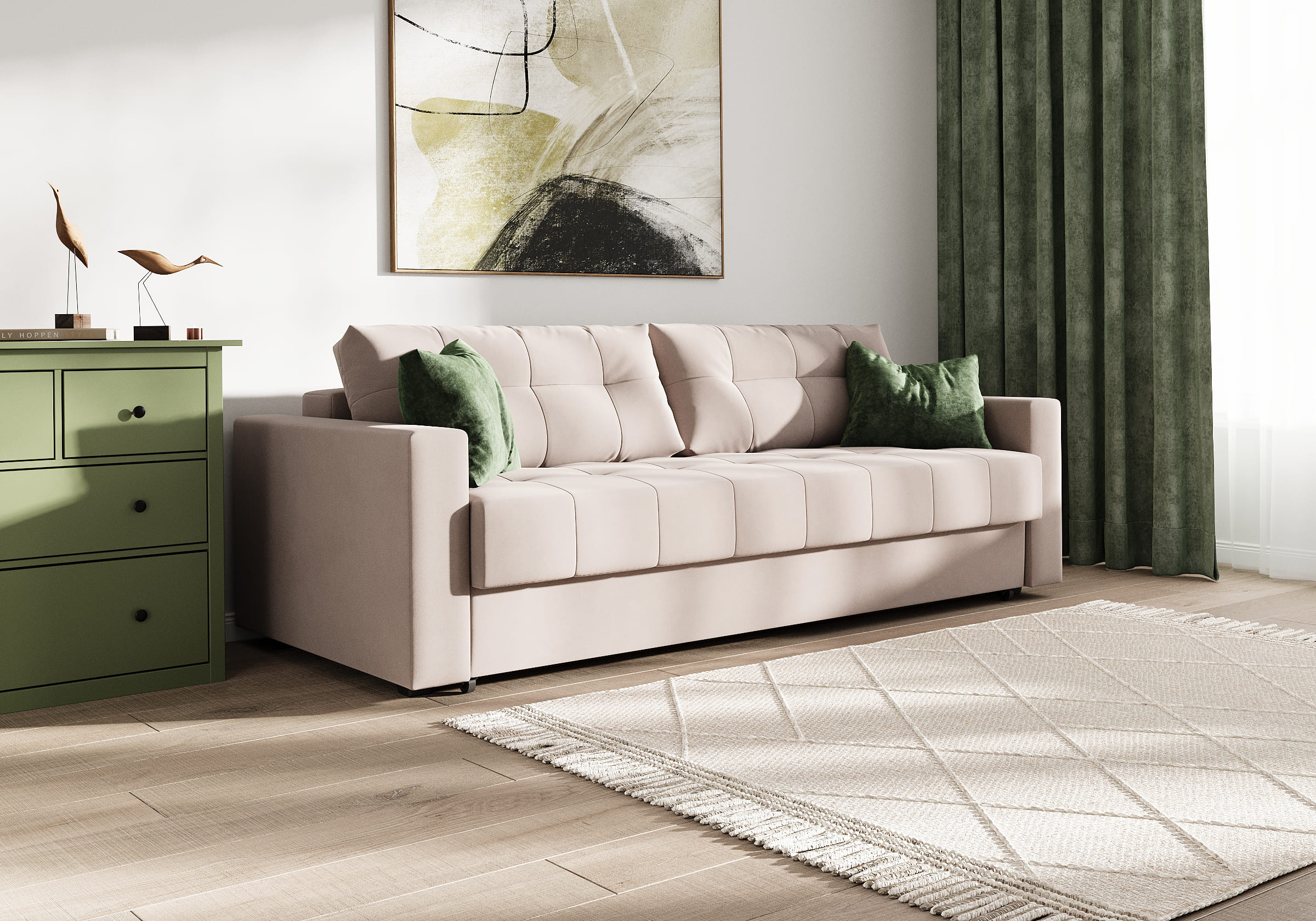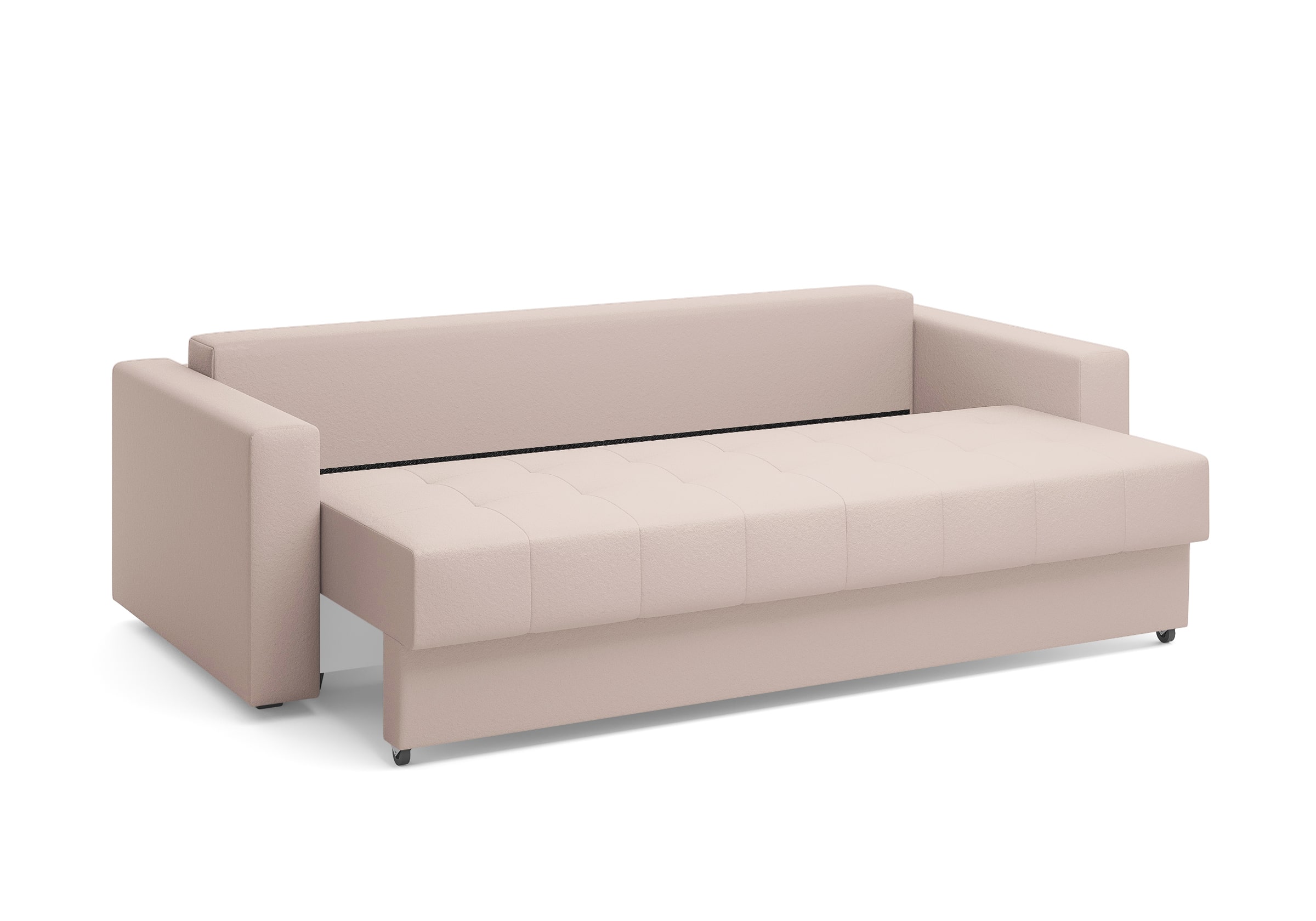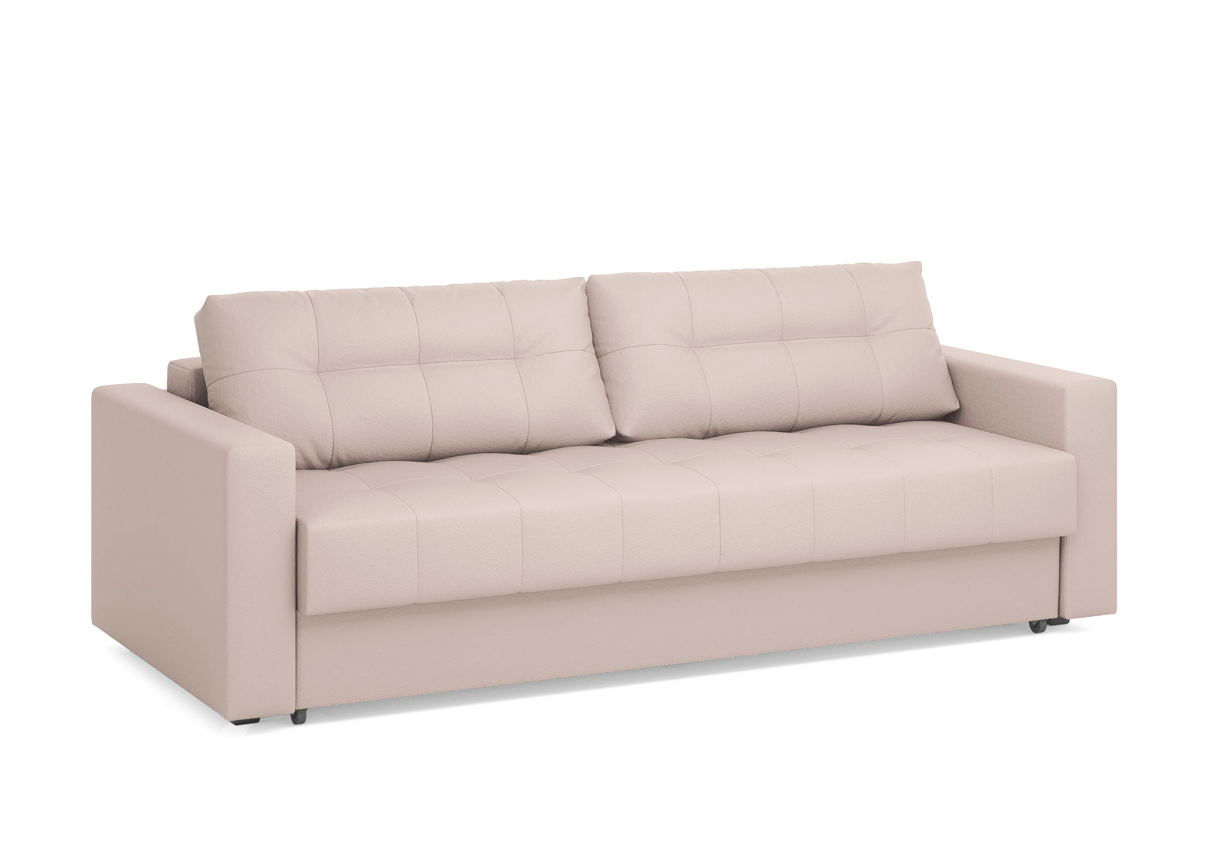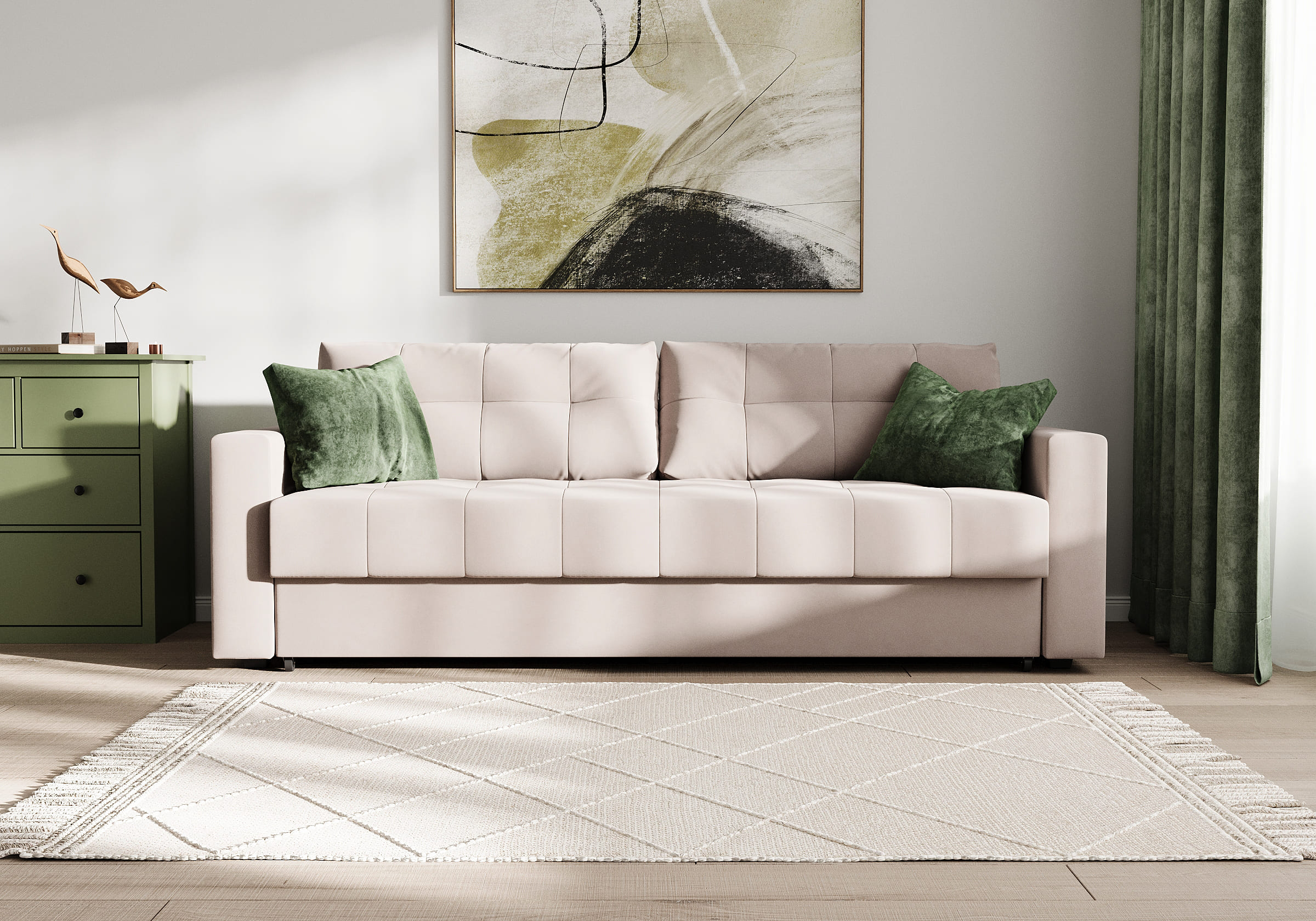Диван для сна с подлокотниками, механизмом трансформации еврокнижка и коробом для хранения. Благодаря объемной стежке в форме квадратов на сидении и подушках, минимальным по высоте опорам, подлокотникам средней ширины, диван органично впишется в большинство современных интерьеров. Матрас анатомический с независимым пружинным блоком обеспечит комфортное спальное место. В основе мягких подушек – микс наполнителей: поролоновая крошка не дает деформироваться, а синтетическое волокно добавляет комфорт.