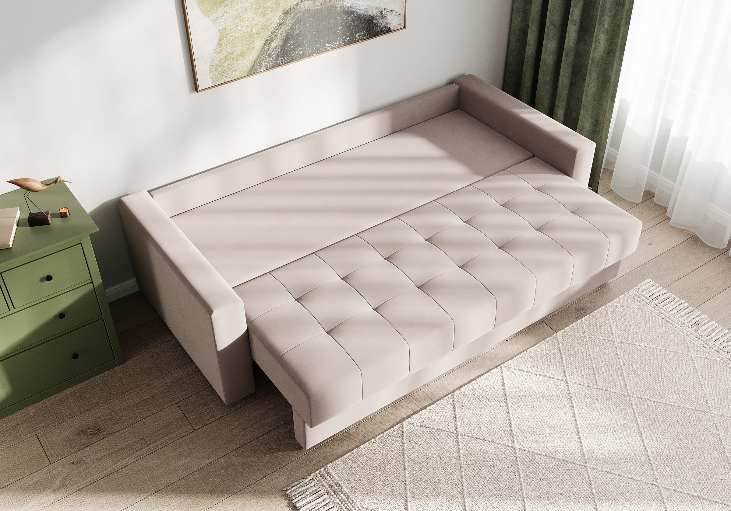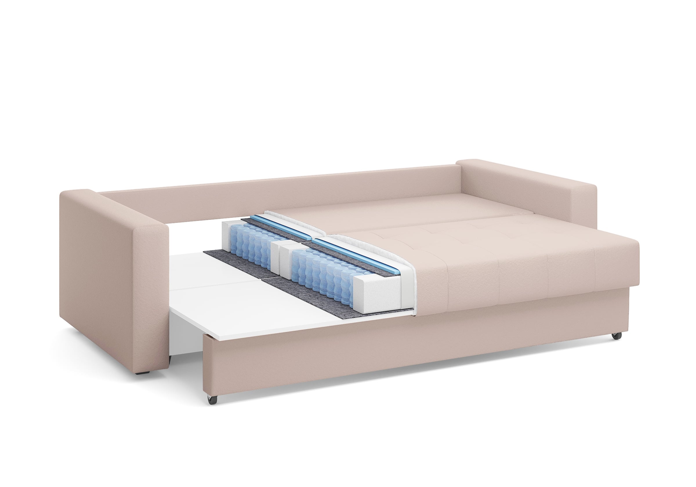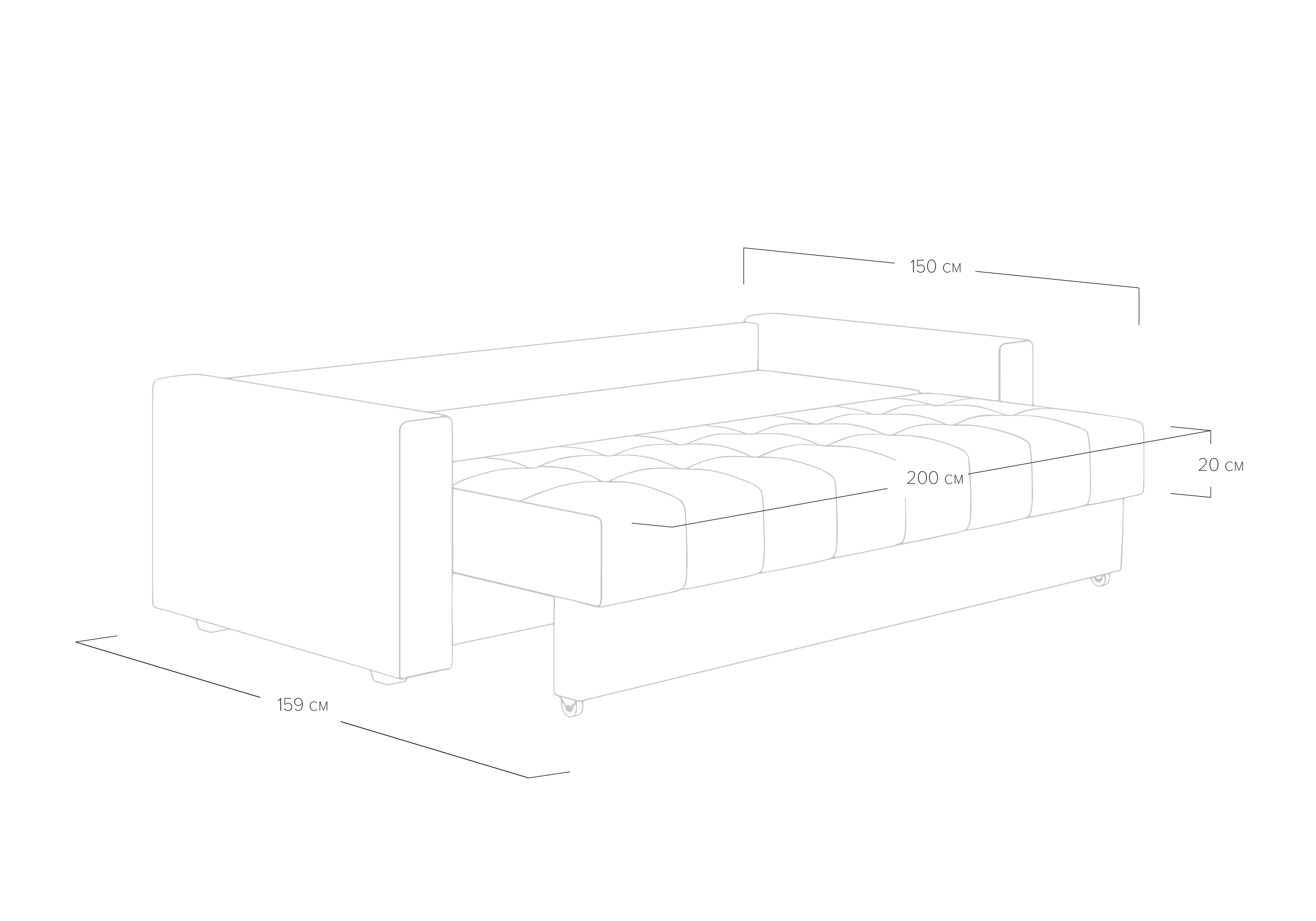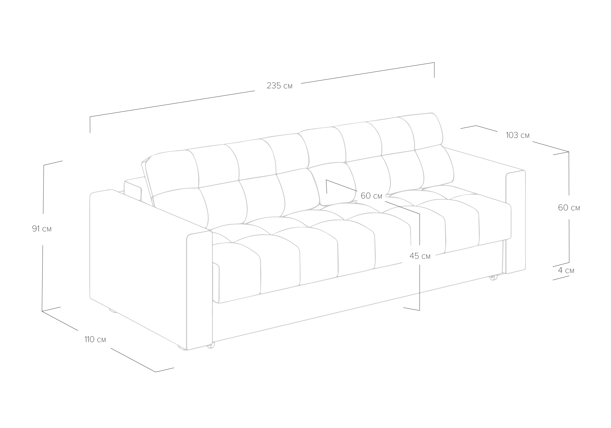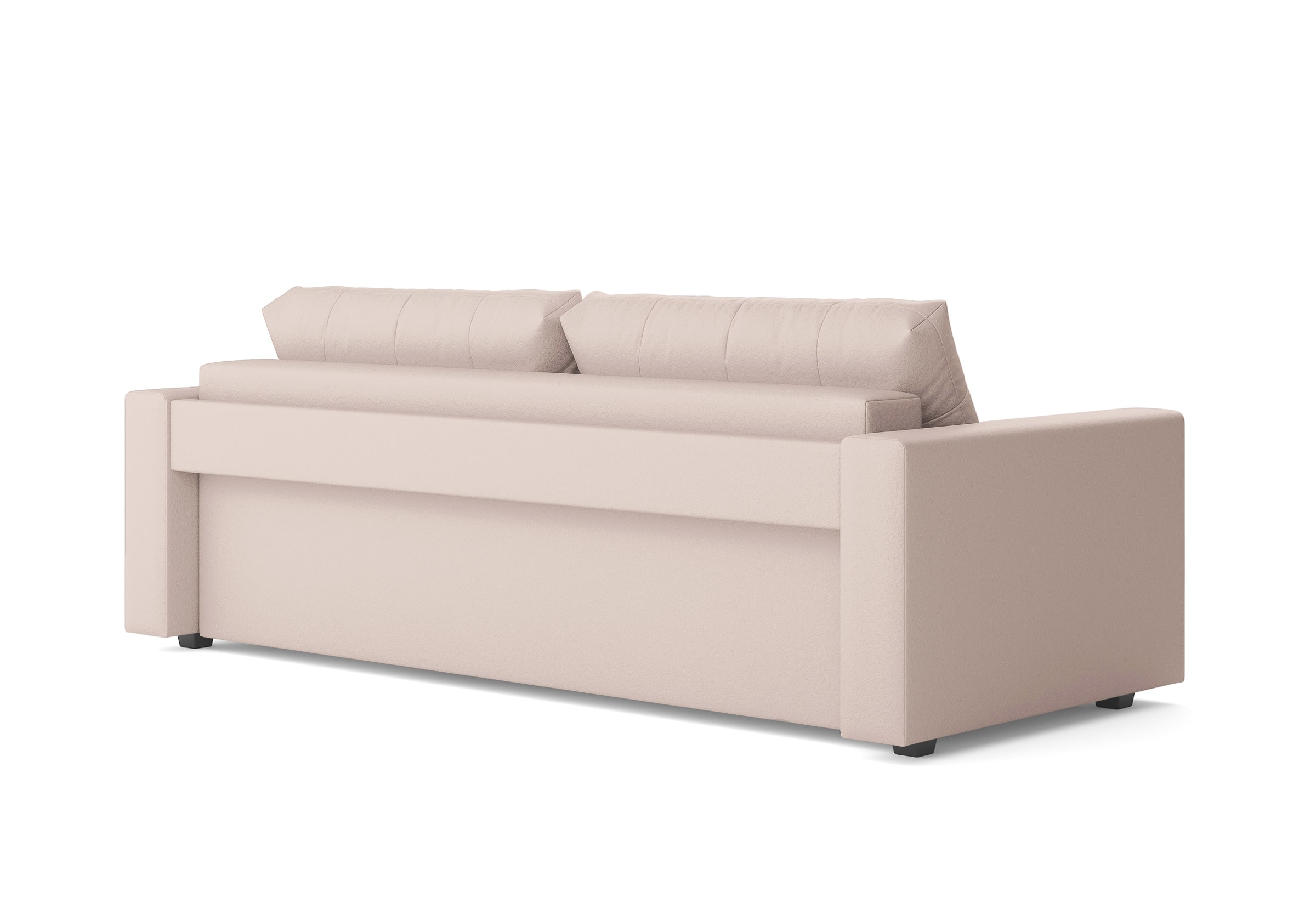 Диван для сна с подлокотниками, механизмом трансформации еврокнижка и коробом для хранения. Благодаря объемной стежке в форме квадратов на сидении и подушках, минимальным по высоте опорам, подлокотникам средней ширины, диван органично впишется в большинство современных интерьеров. Матрас анатомический с независимым пружинным блоком обеспечит комфортное спальное место. В основе мягких подушек – микс наполнителей: поролоновая крошка не дает деформироваться, а синтетическое волокно добавляет комфорт.