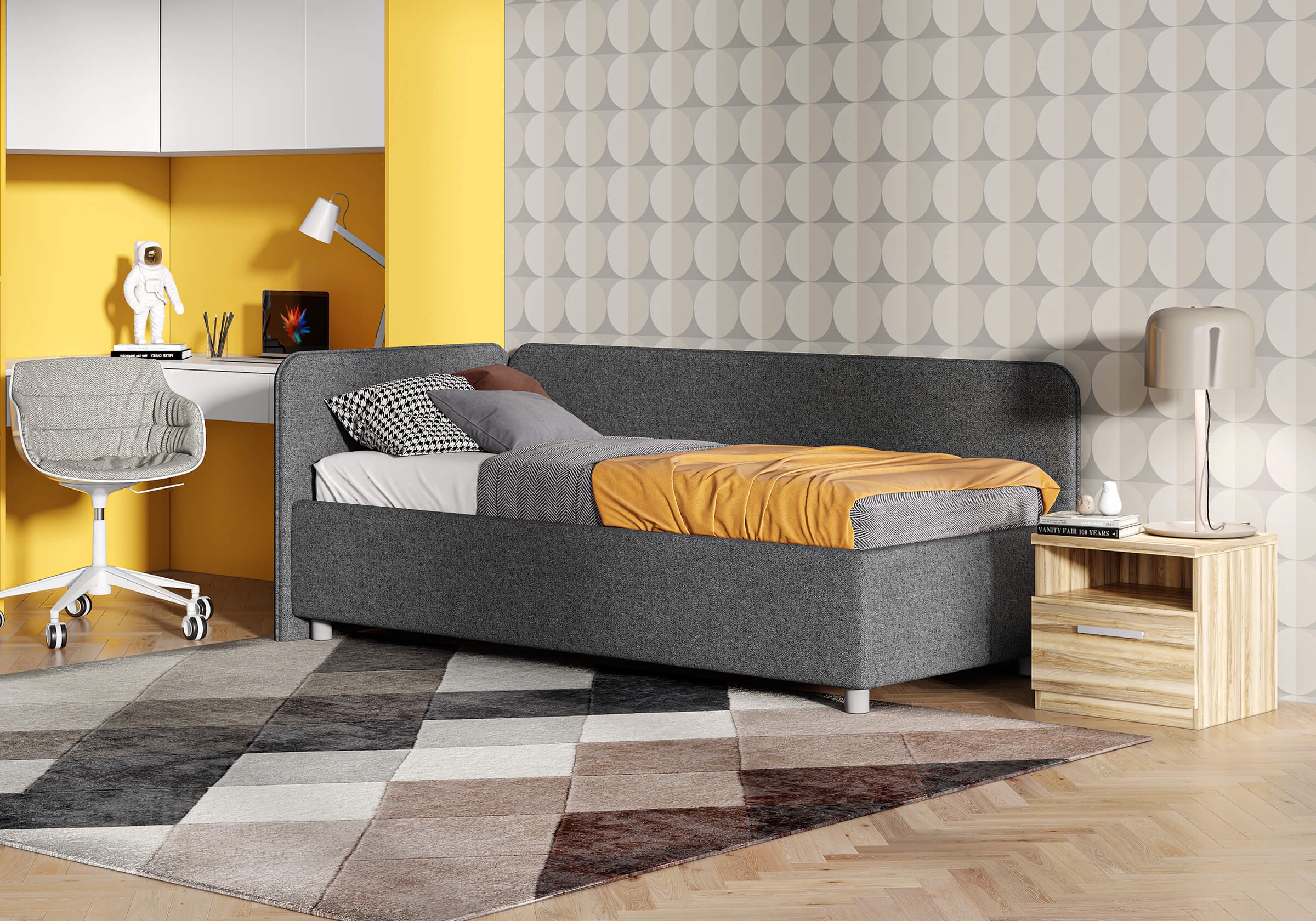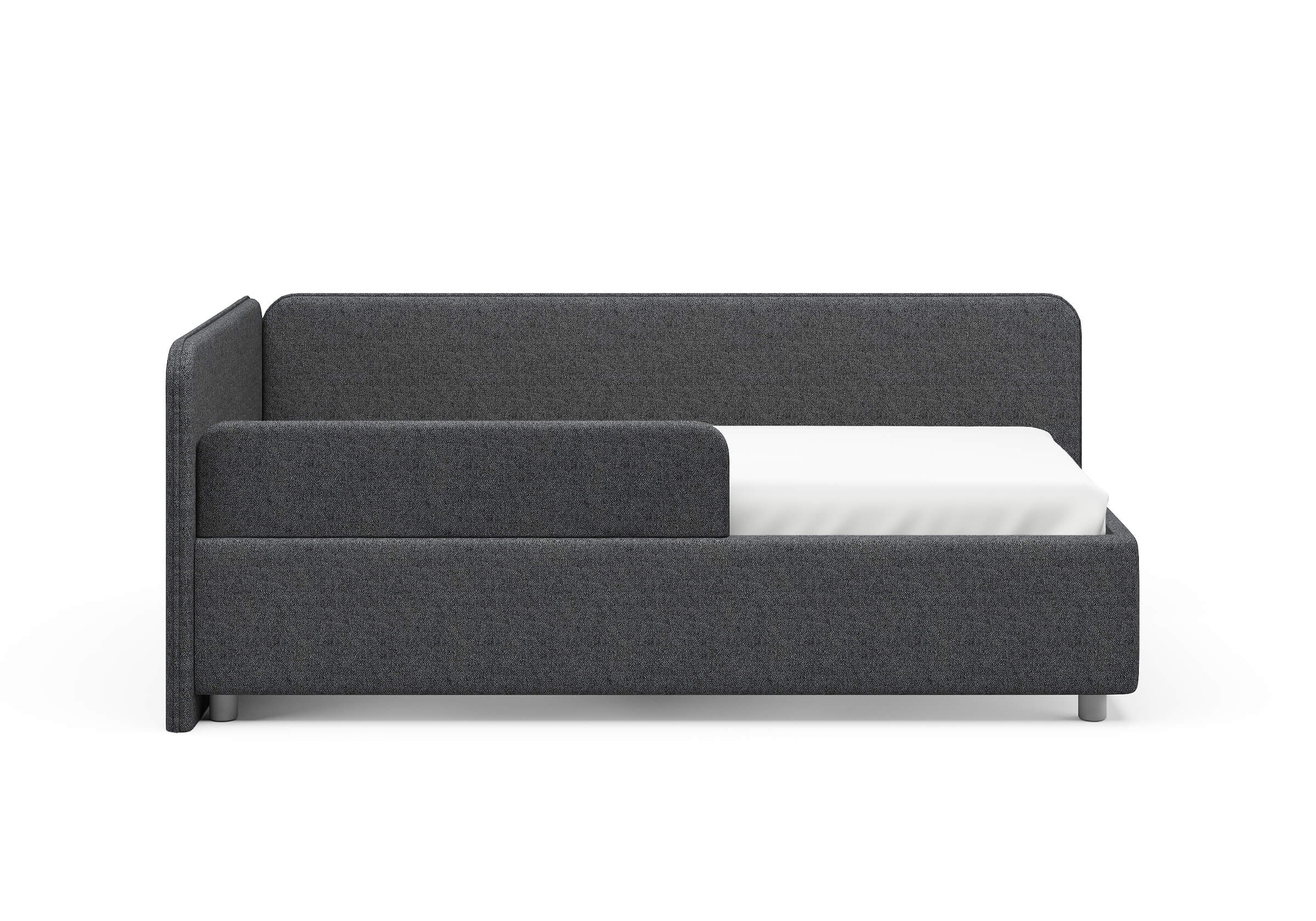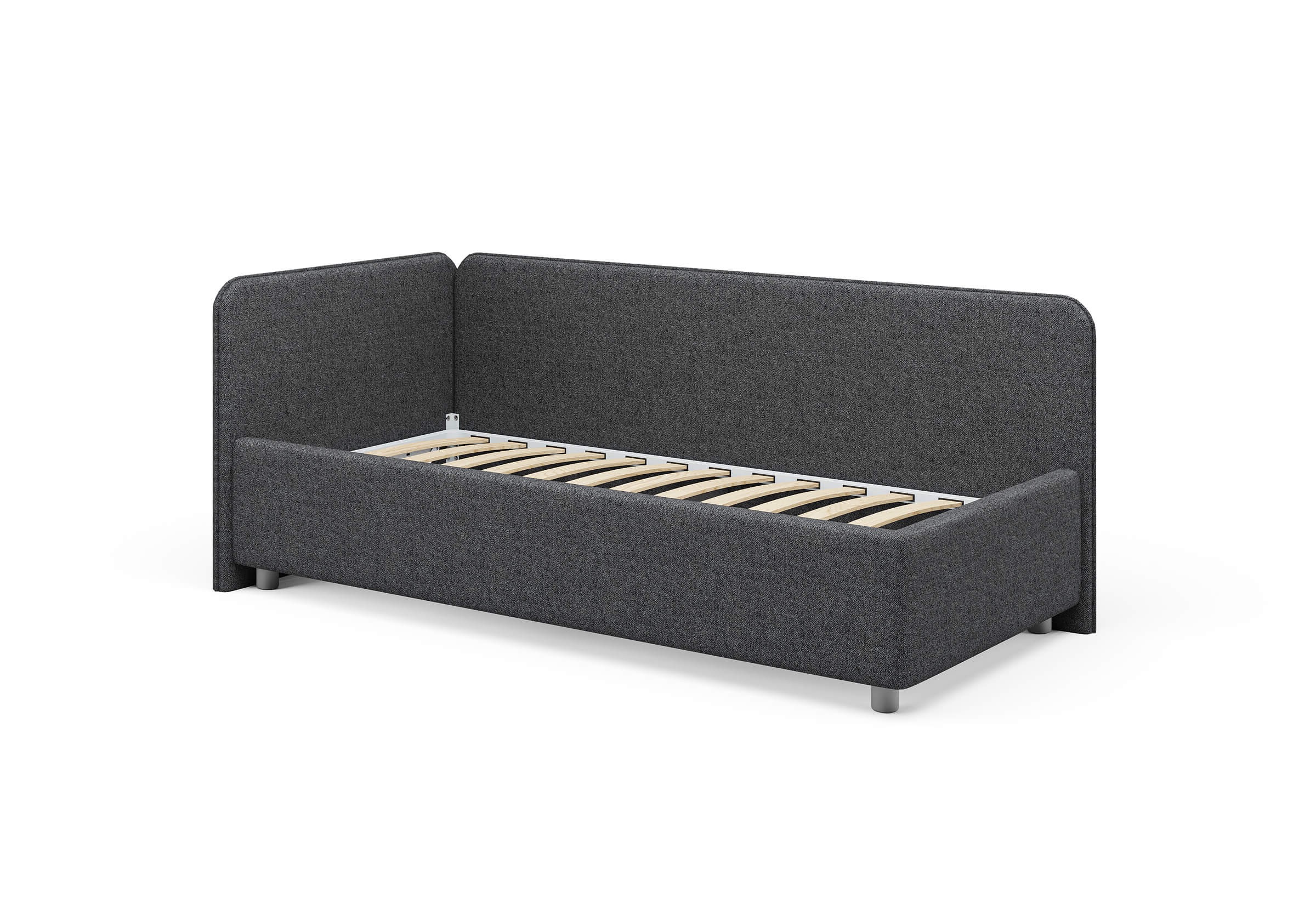 Односпальная кровать в современном стиле. Кровать-софа с одной боковой спинкой. Идеально подходит для квартир с небольшой площадью, детских и подростковых спален, гостевых комнат. Боковую спинку кровати можно изготовить на выбор на правую или левую сторону. Модель изготовлена из ДСП. Дополнительно можно выбрать ортопедическое основание или укомплектовать кровать подъемным механизмом с бельевым ящиком. Каркас основания выполнен из металла, ламели - из берёзы. Данная модель стала героем программы "Квартирный вопрос" на телеканале НТВ. Выпуск можно посмотреть здесь.