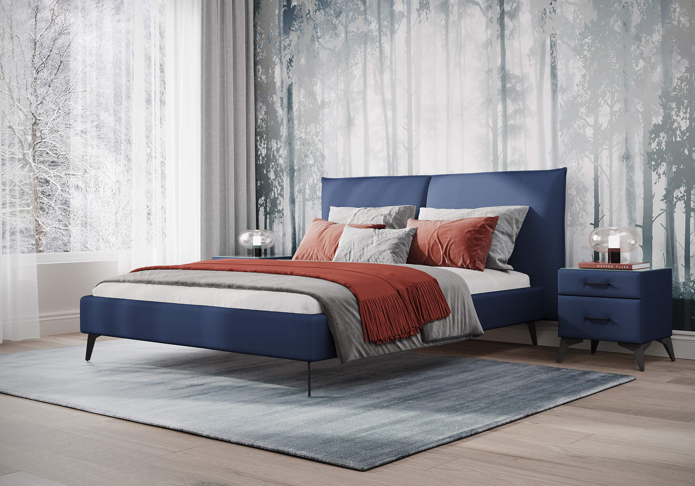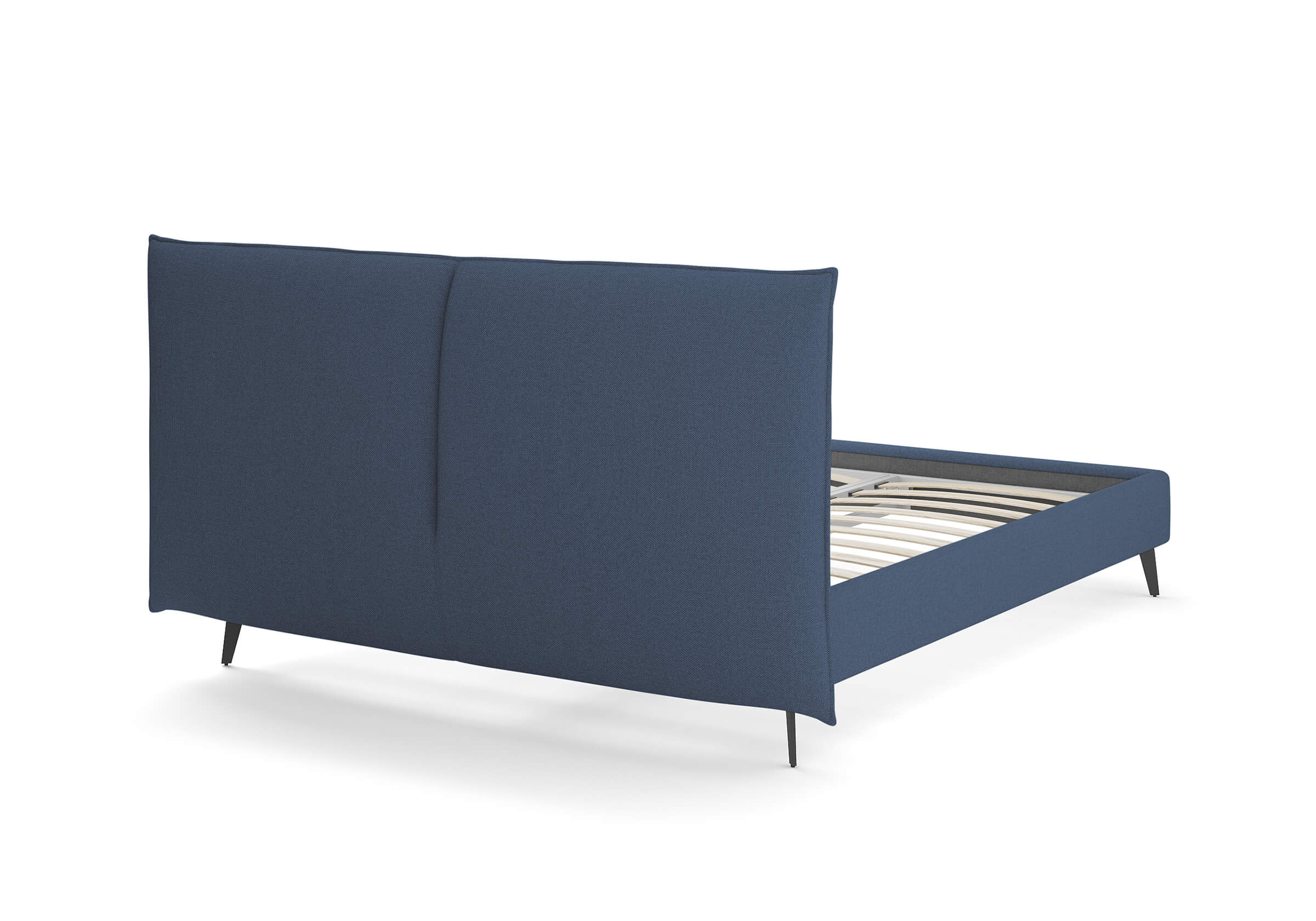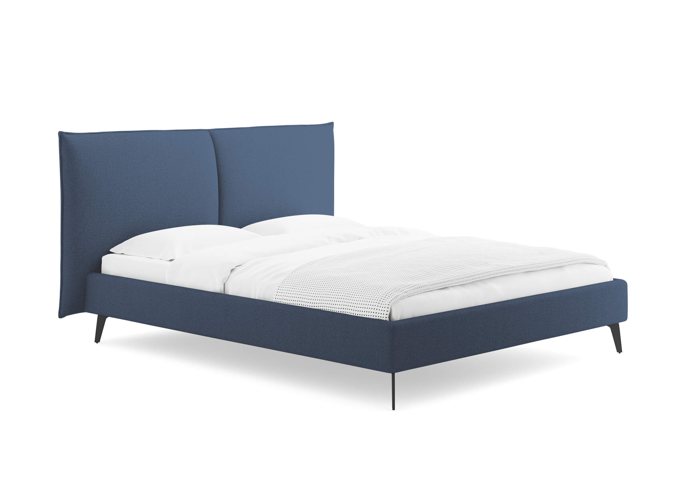 Кровать с мягким изголовьем в виде больших подушек, которые придают спальне особую атмосферу комфорта и уюта. Сзади данная модель полностью обита мебельной тканью, что сохраняет целостность образа и позволяет поставить кровать в центр комнаты. Высокие металлические опоры создают ощущение легкости и изящности, облегчая поддержание чистоты, что делает изделие практичным для повседневного использования.