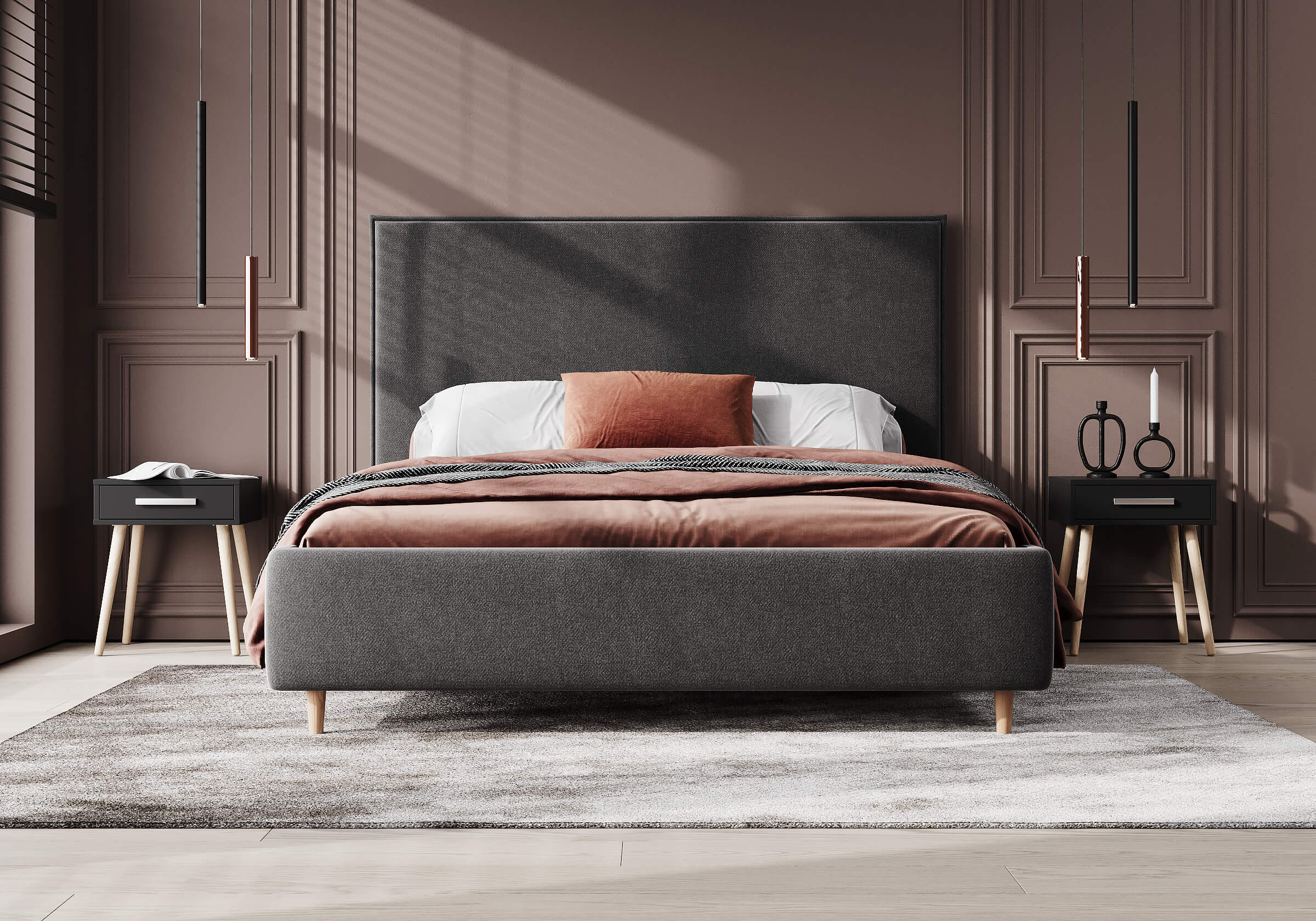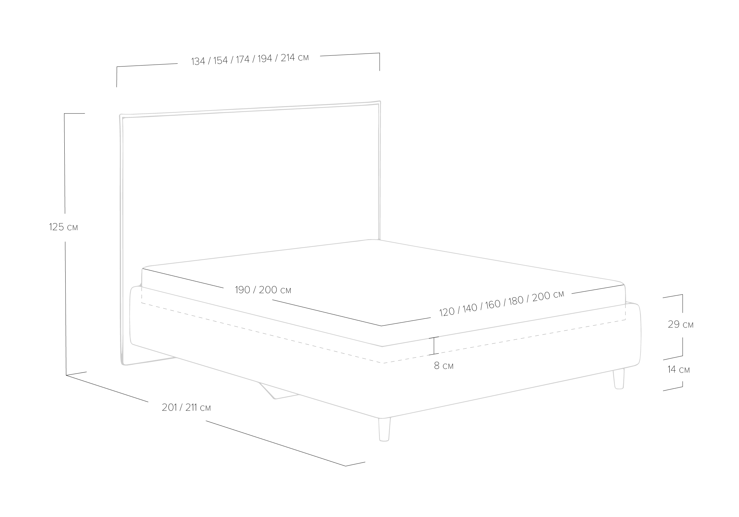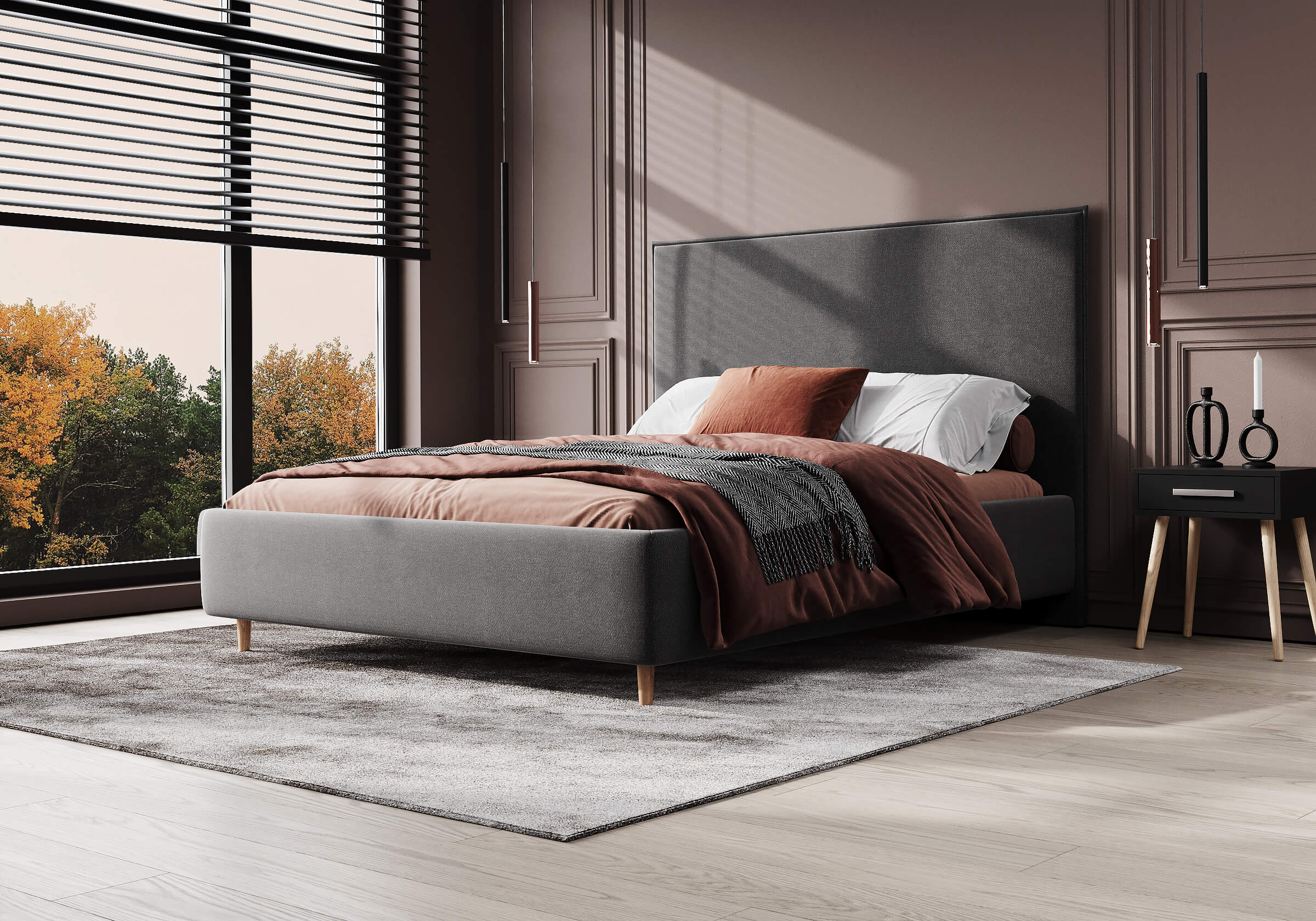Кровать Eveline для современных интерьеров в скандинавском стиле. Выглядит эффектно благодаря мягкому высокому изголовью с декоративным кантом по периметру и опорам из натурального дерева. Модель будет смотреться выигрышно и актуально в интерьере, делая спальню уютнее, настраивая на отдых. При необходимости кровать может быть укомплектована разборным или неразборным металлическим основанием с ламелями, подъемным механизмом с бельевым коробом.