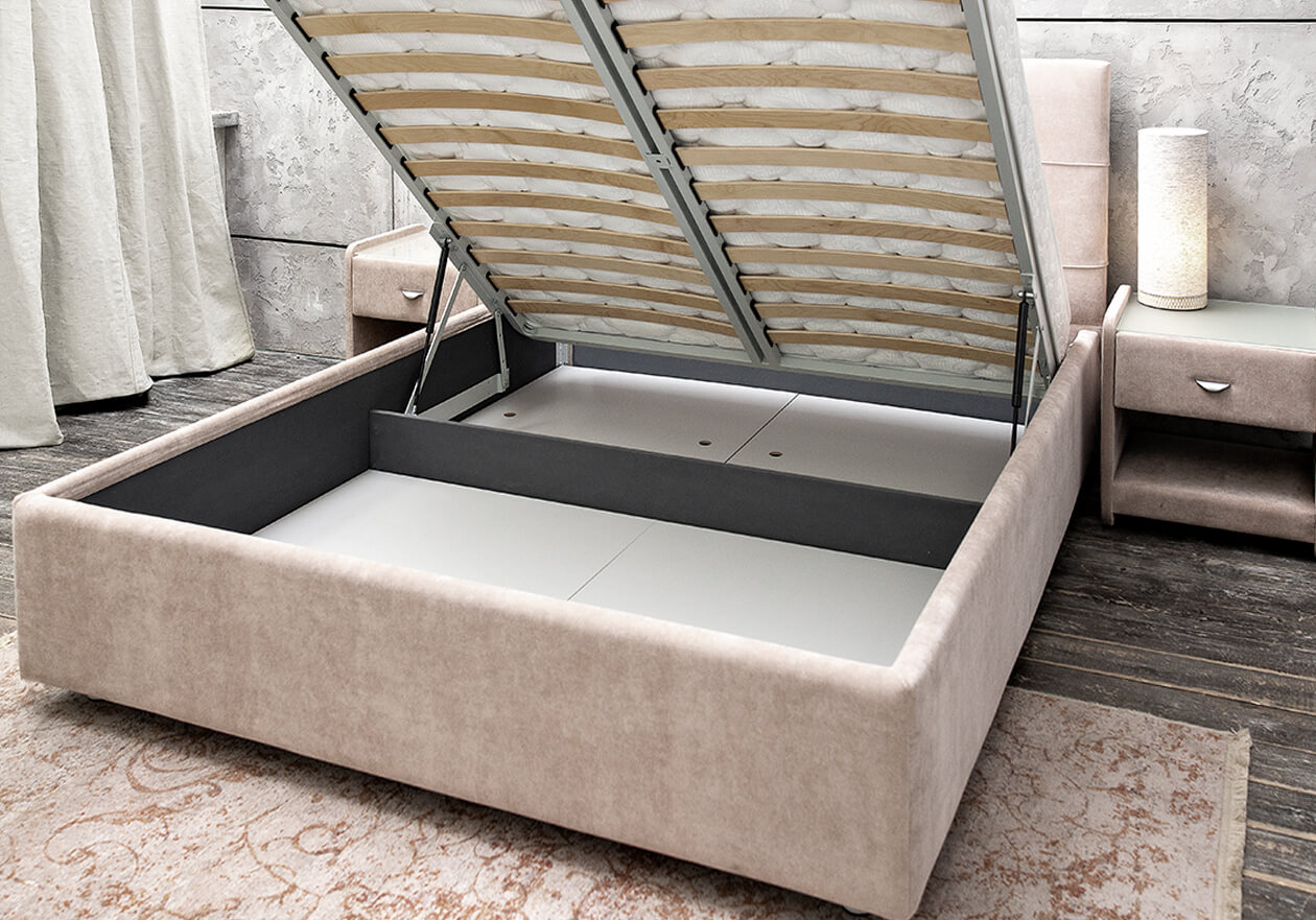 Возможность установки подъемного механизма со вместительным бельевым ящиком. Дно бельевого ящика легко сдвигается для обеспечения уборки под кроватью.