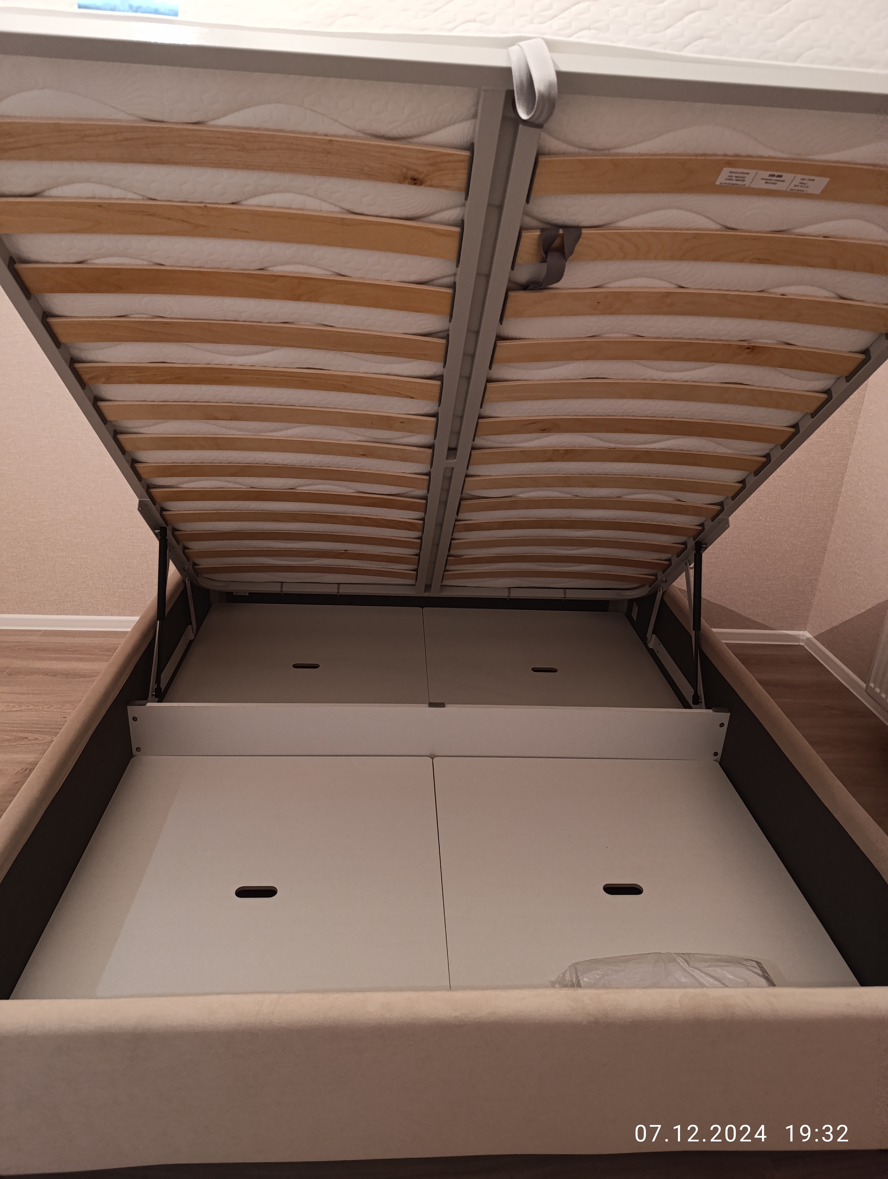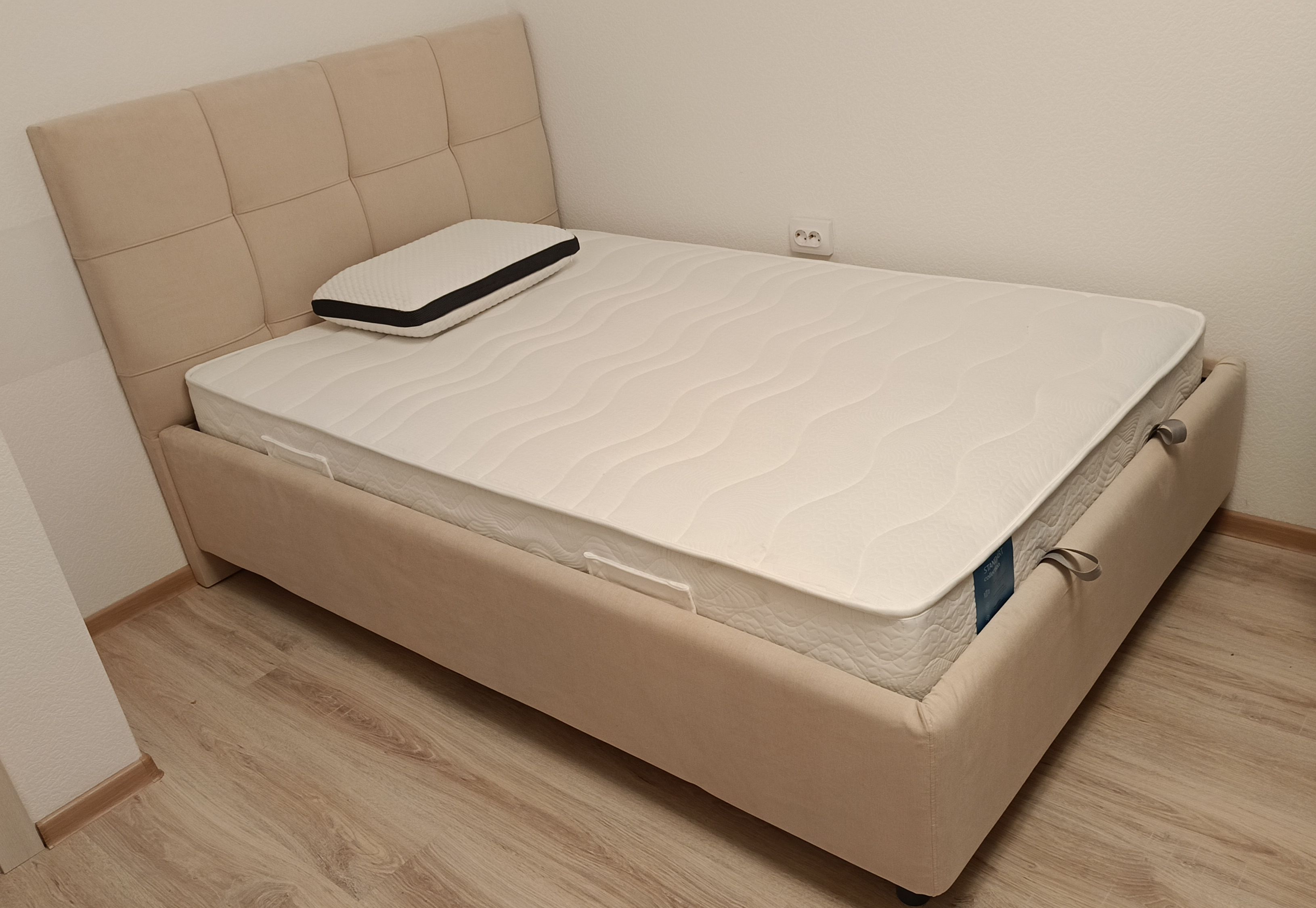 Приобрели кровать Caprice. В эксплуатации немного более месяца . Кровать очень основательная, нареканий никаких нет. Уголки основания все у кровати закрыты, нет неэстетичных стыков. Даже в недорогой ткани смотрится отлично. Опасалась, что тяжело будет самой поднимать подъемный механизм, опасения были напрасны. Единственное, наверно бы сейчас положила бы матрас 20-25 см, 29 для нас высоковато получилось.
