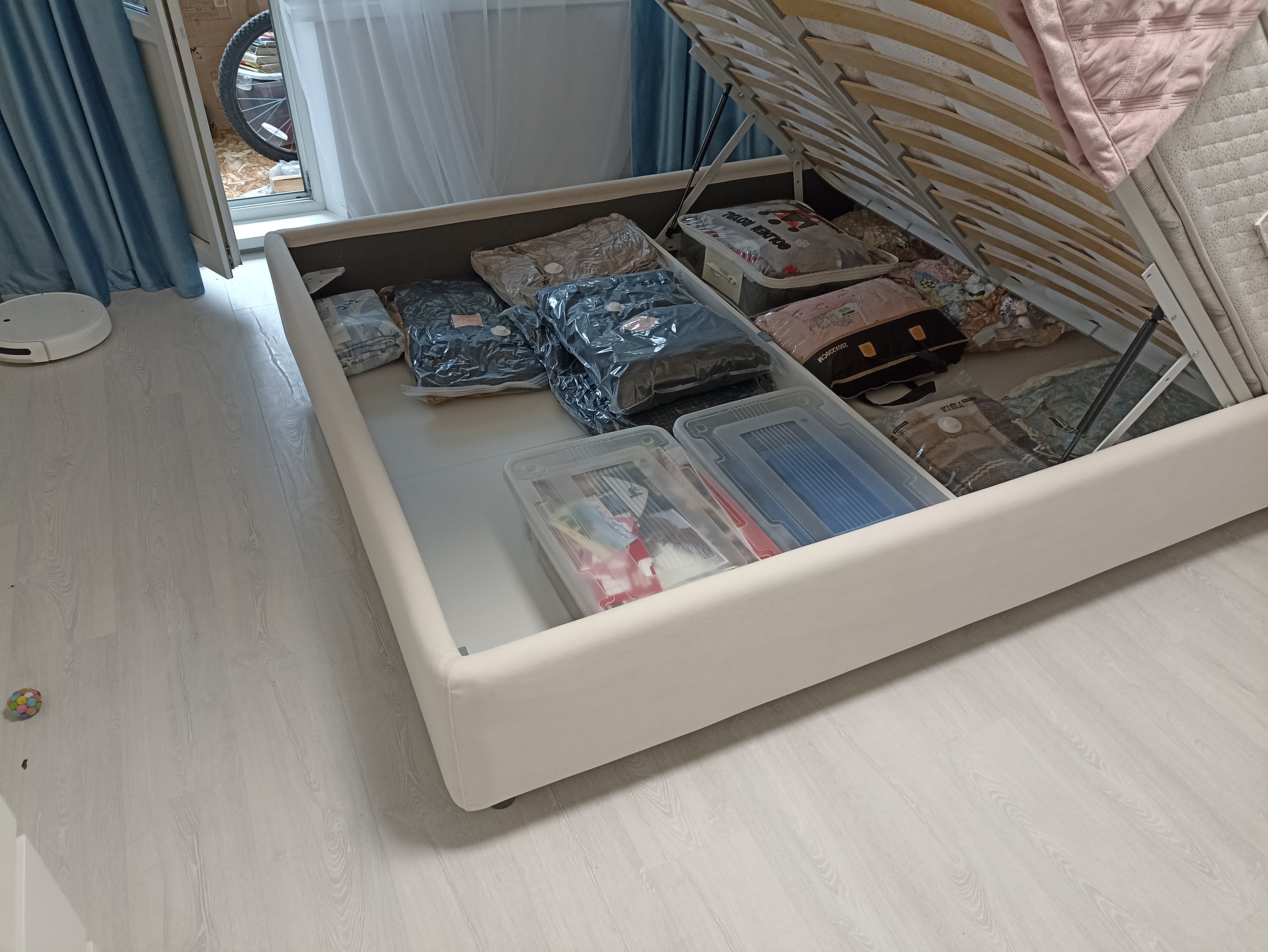 Возможна установка подъемного механизма со вместительным бельевым ящиком. Дно бельевого ящика легко сдвигается для обеспечения уборки под кроватью.