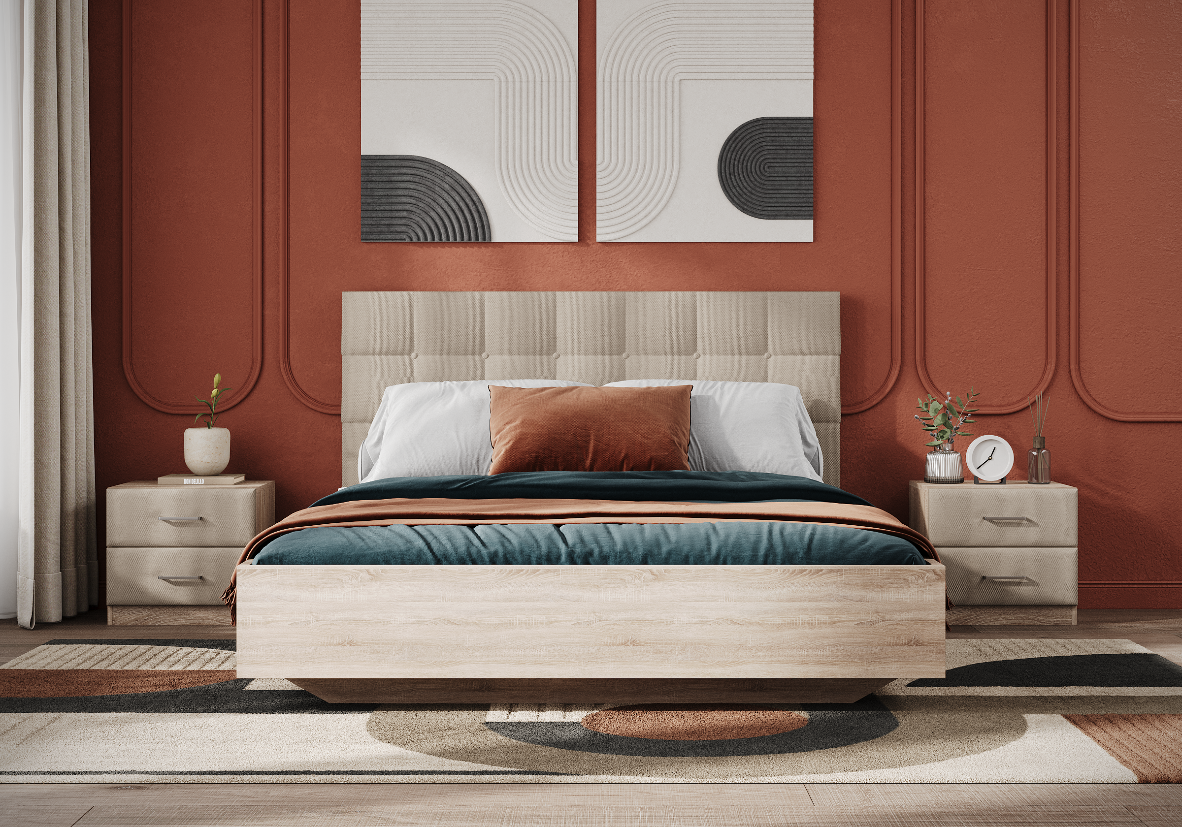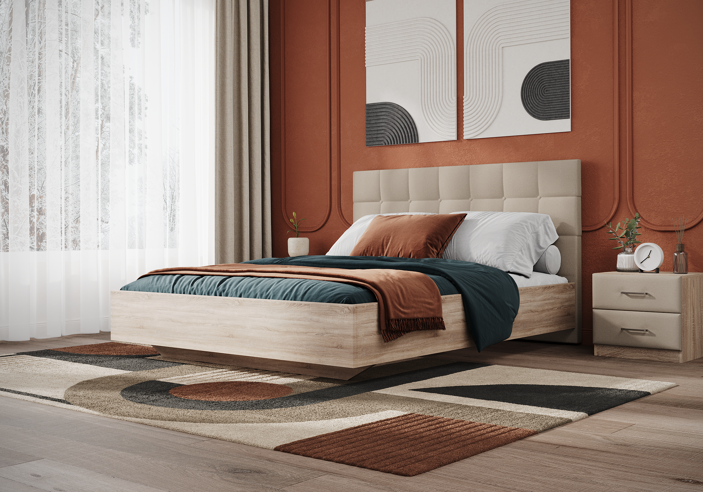 Царги из ЛДСП увеличенной толщины придадут строгость и надежность. Благодаря сочетанию усиленных металлических уголков, ребер жесткости и эксцентриковой стяжке конструктив кровати получается жёстким и прочным.