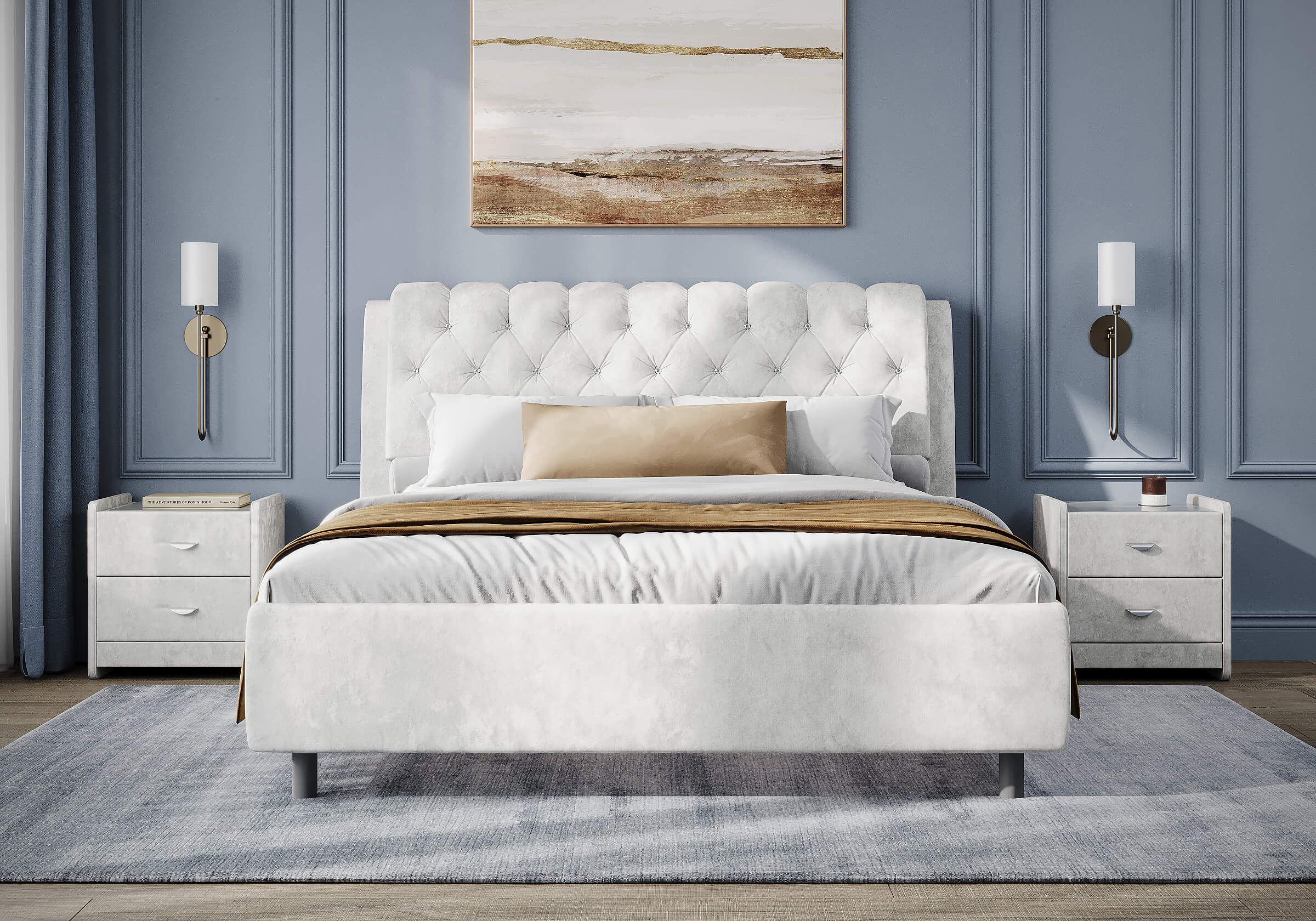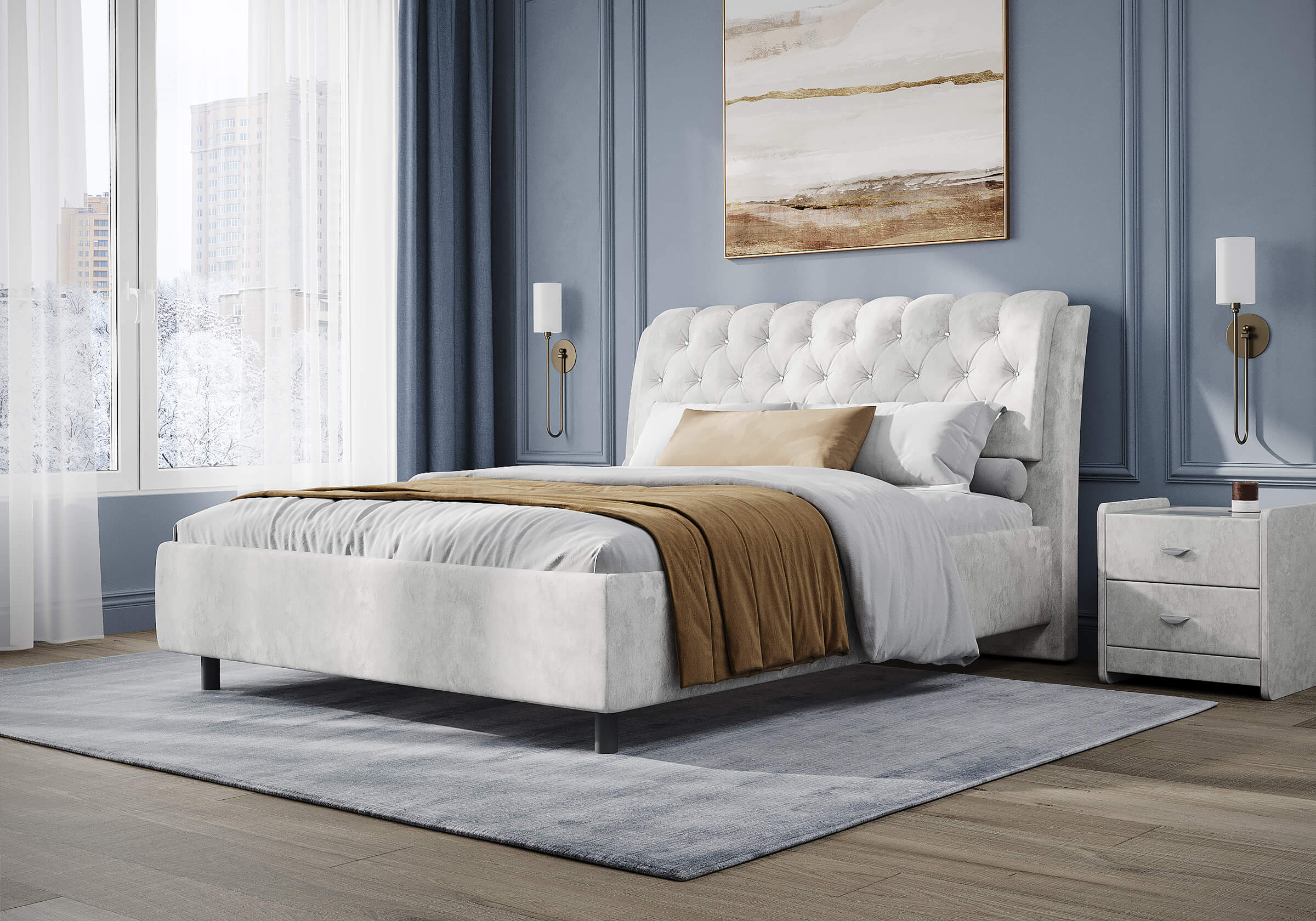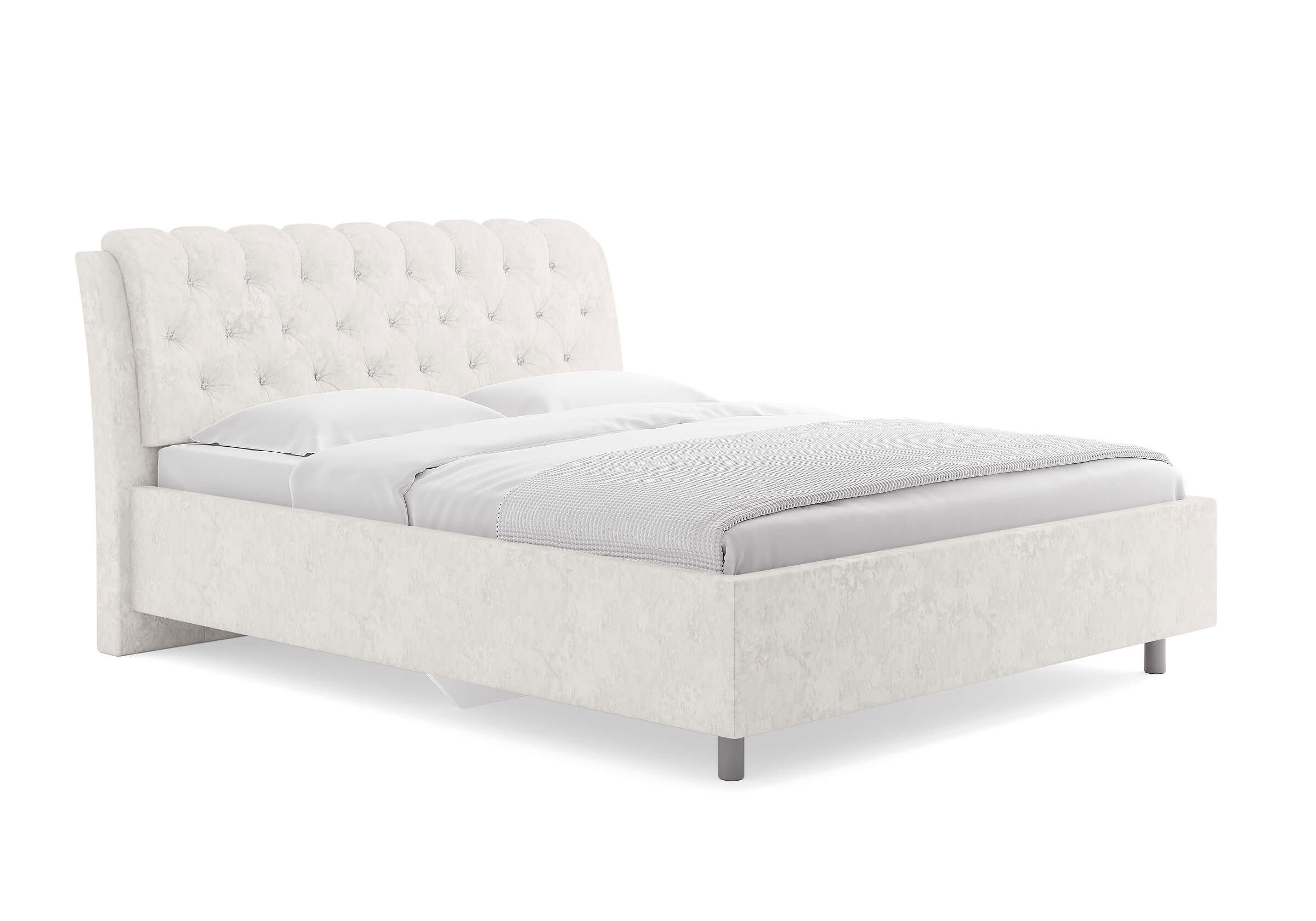 Элегантная интерьерная кровать с изголовьем, украшенным декоративными пуговицами и глубокой пиковкой. Модель изготовлена из ДСП. При необходимости кровать может быть укомплектована разборным или неразборным металлическим основанием с ламелями, подъемным механизмом с бельевым ящиком, трансформируемым основанием Aquarius.