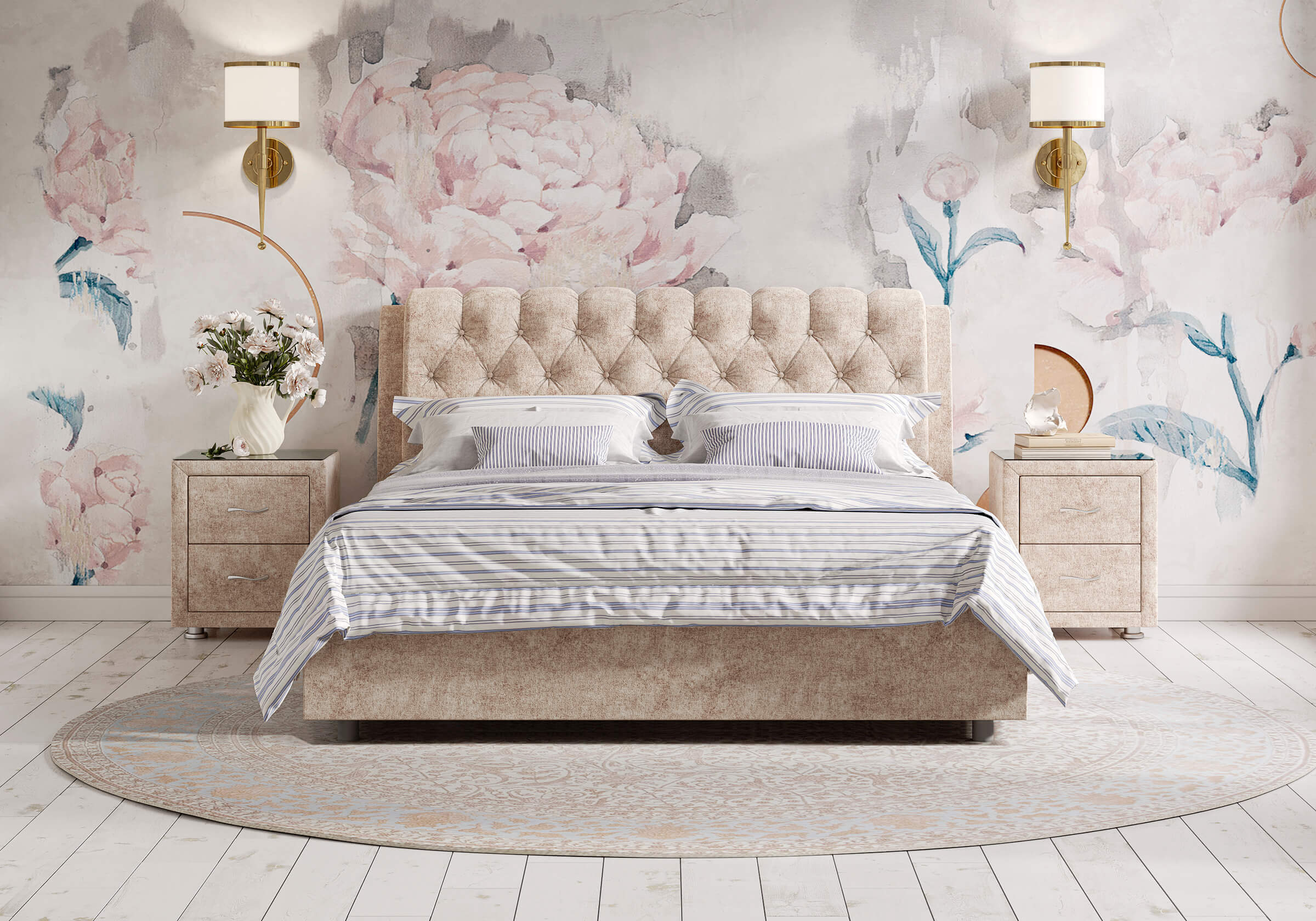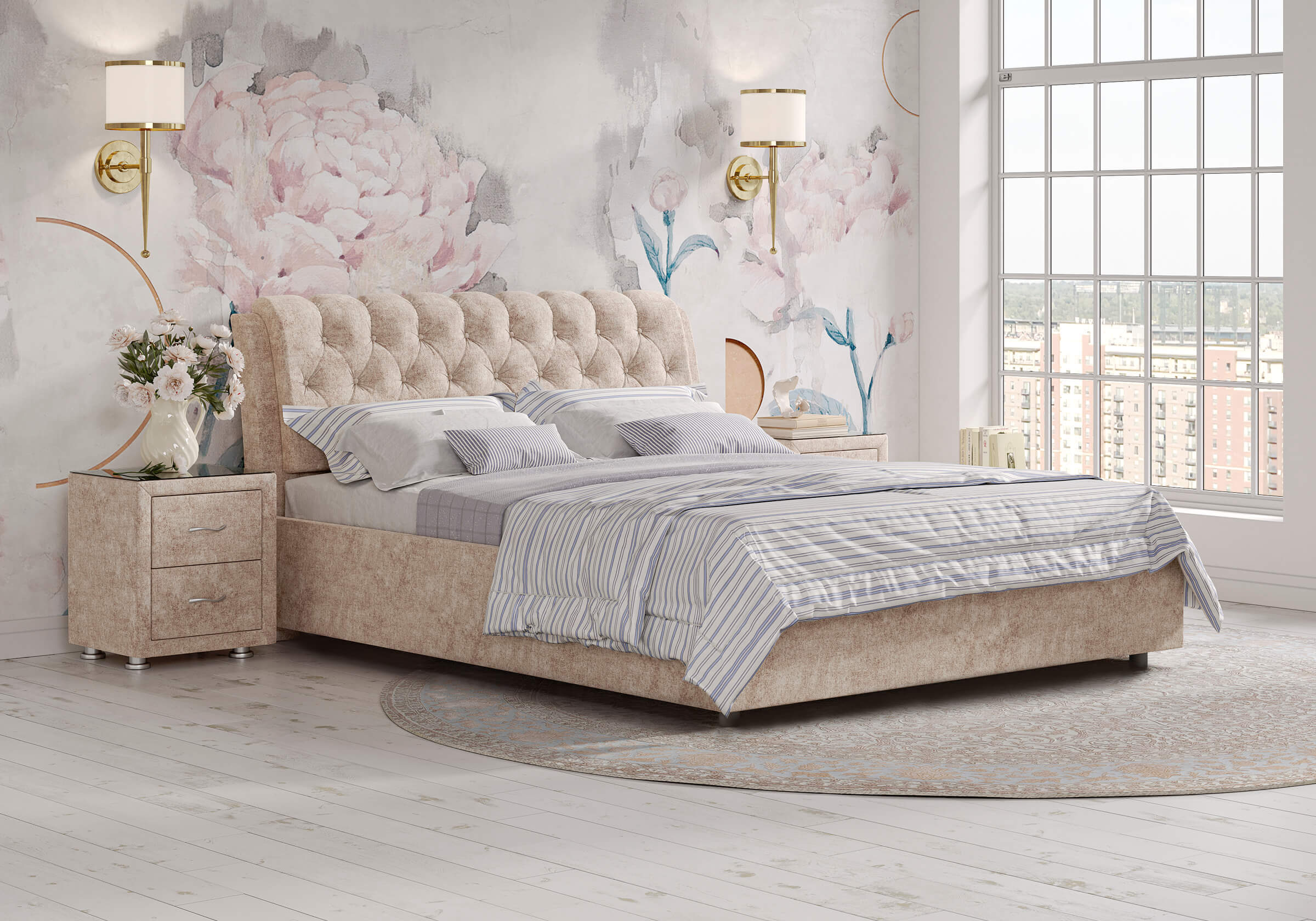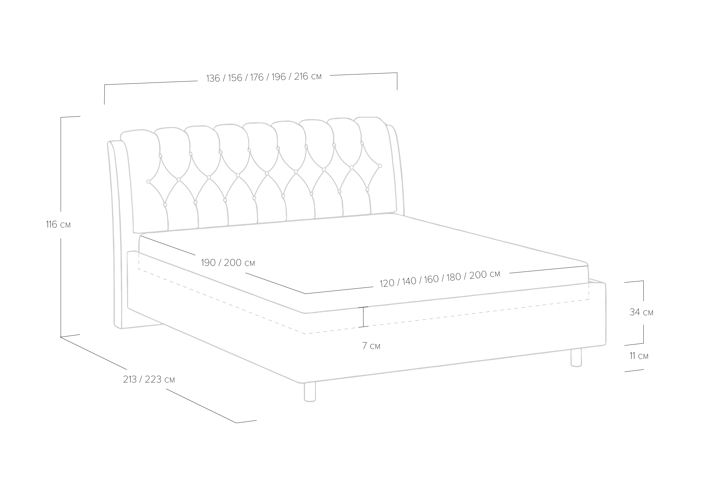 Элегантная интерьерная кровать с изголовьем, украшенным декоративными пуговицами и глубокой пиковкой. Модель изготовлена из ДСП. При необходимости кровать может быть укомплектована разборным или неразборным металлическим основанием с ламелями, подъемным механизмом с бельевым ящиком, трансформируемым основанием Aquarius.