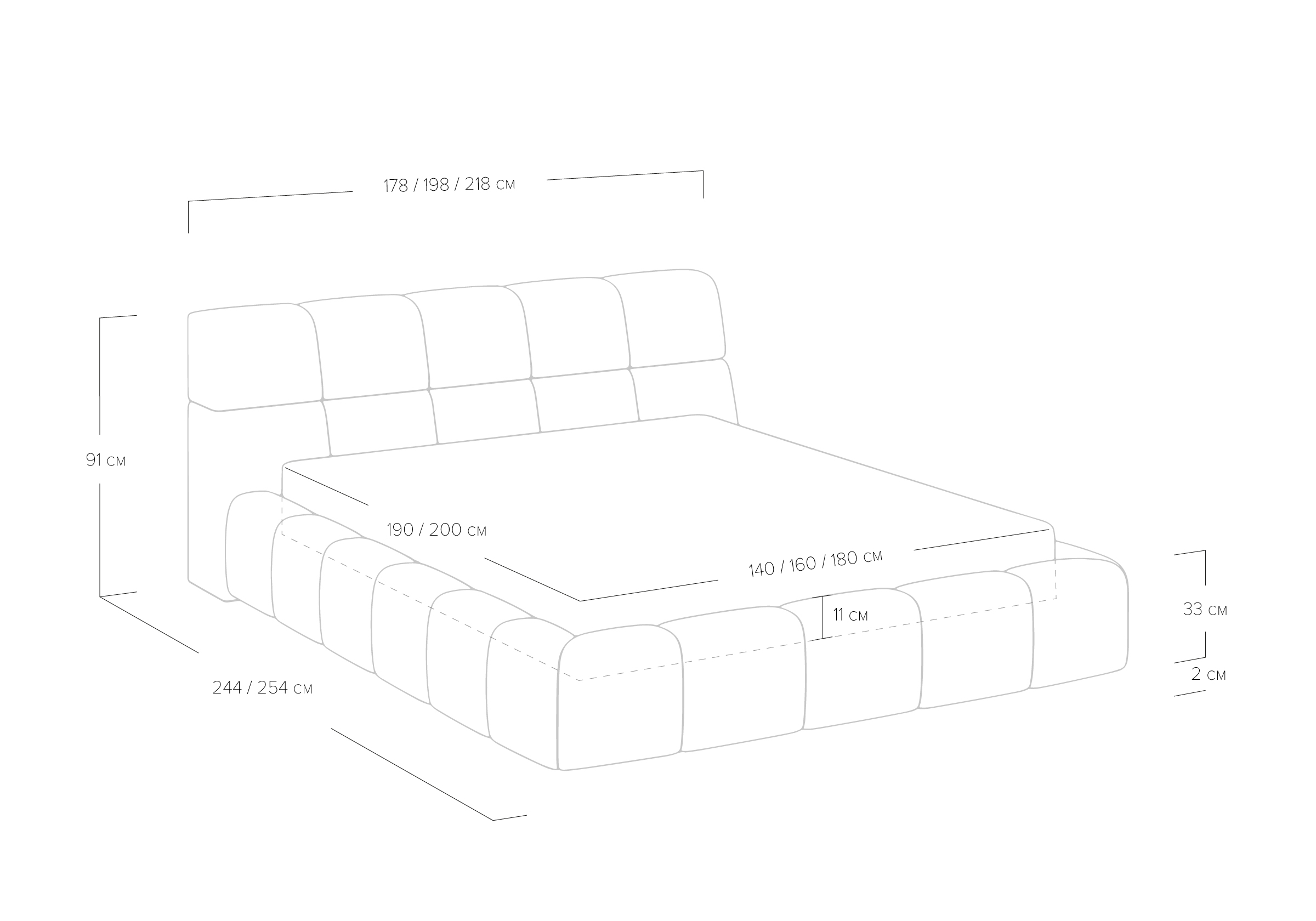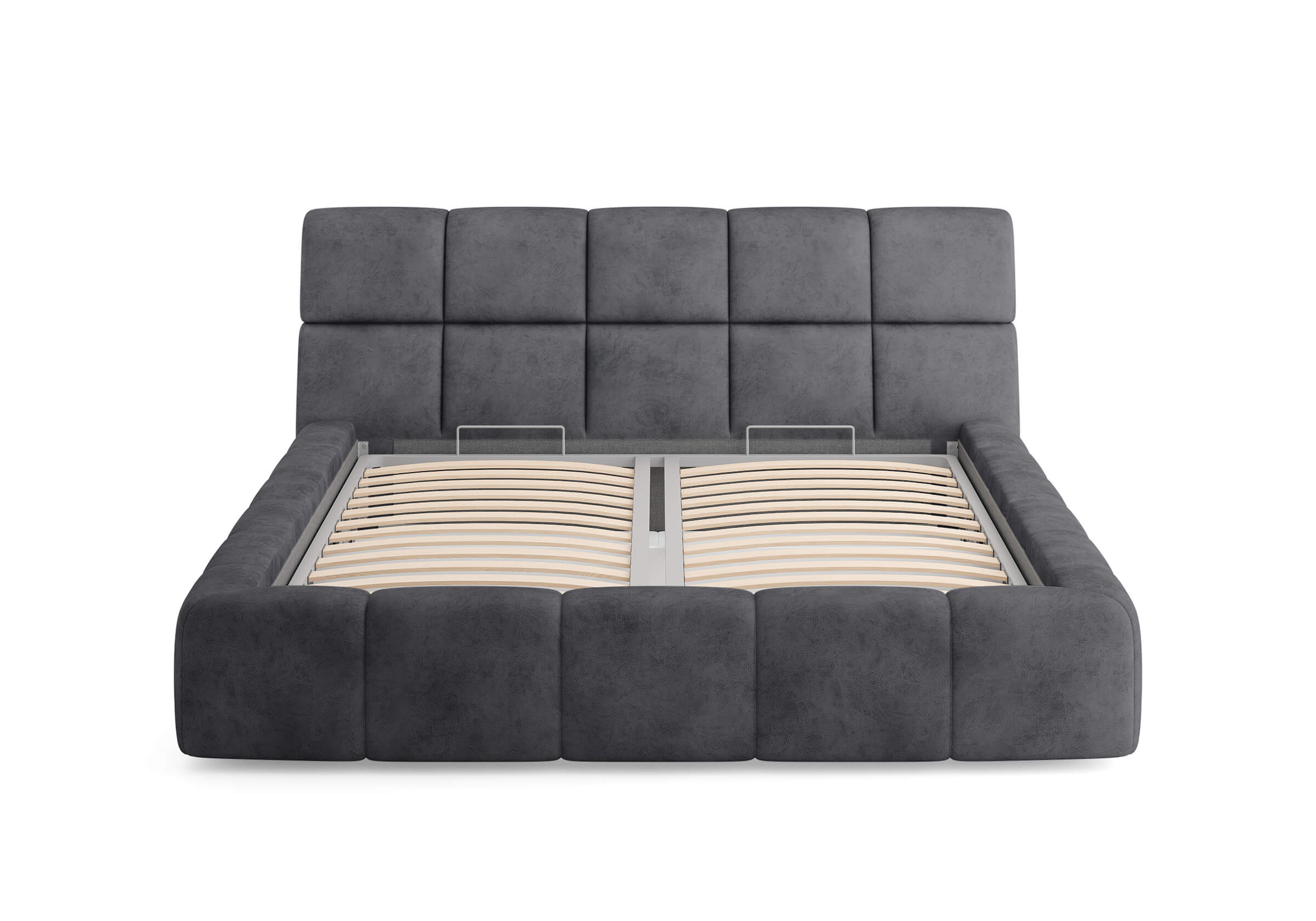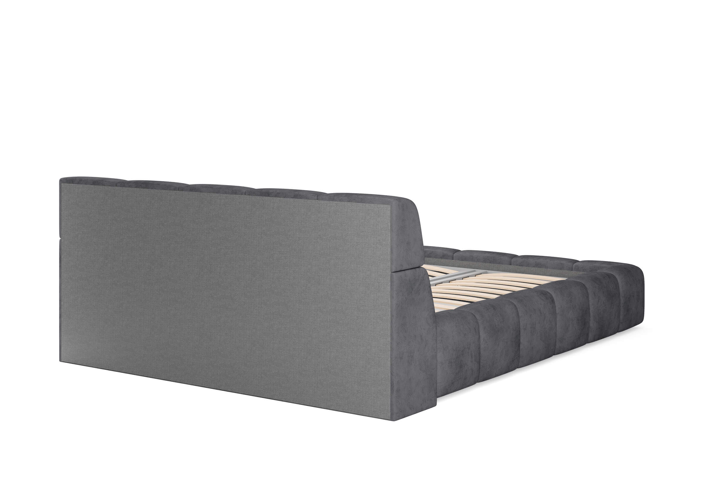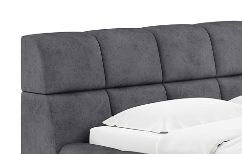 Изголовье выполнено в виде скруглённых квадратов. Модульное мягкое изголовье придают кровати дизайнерский вид.