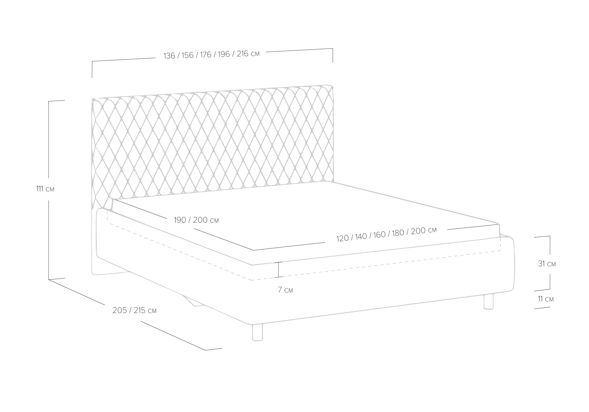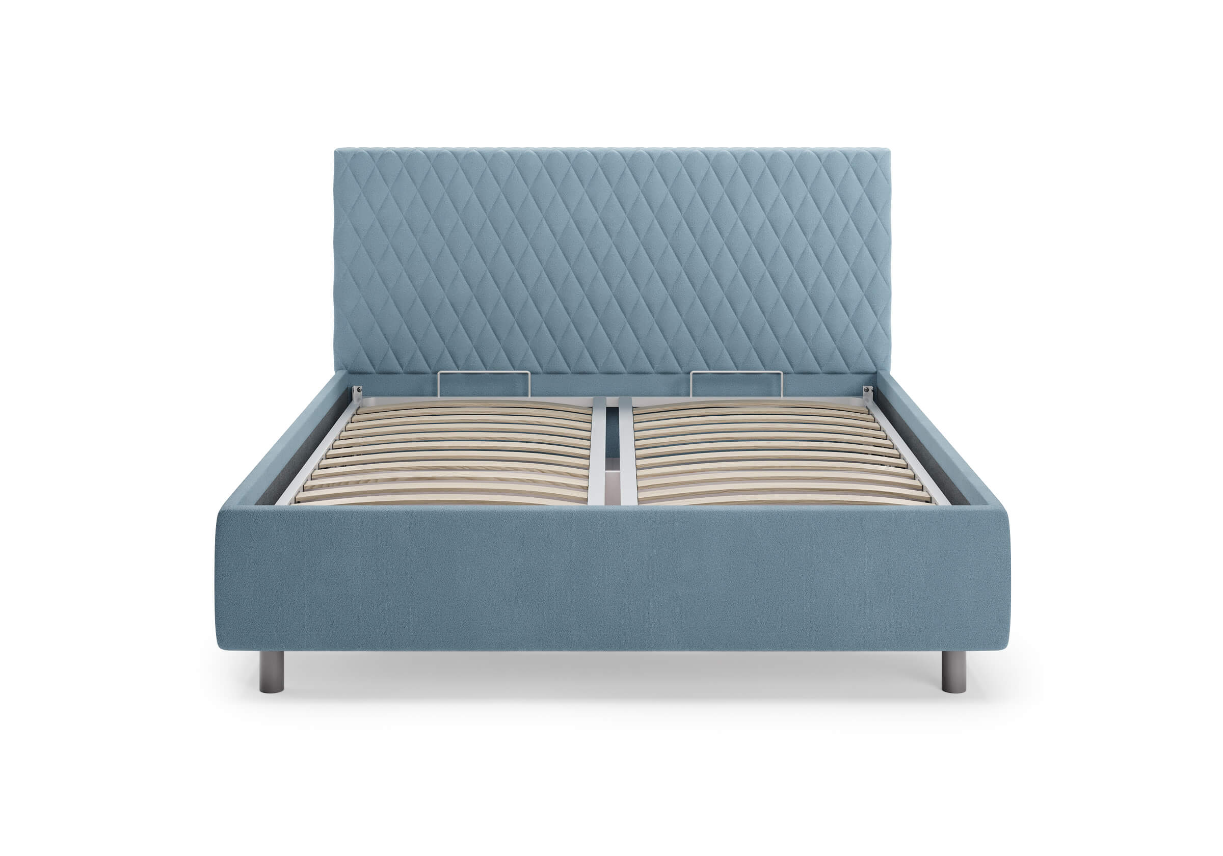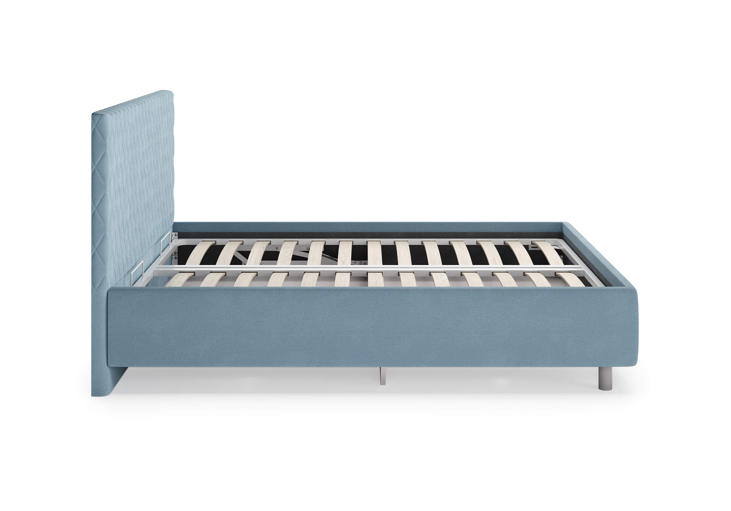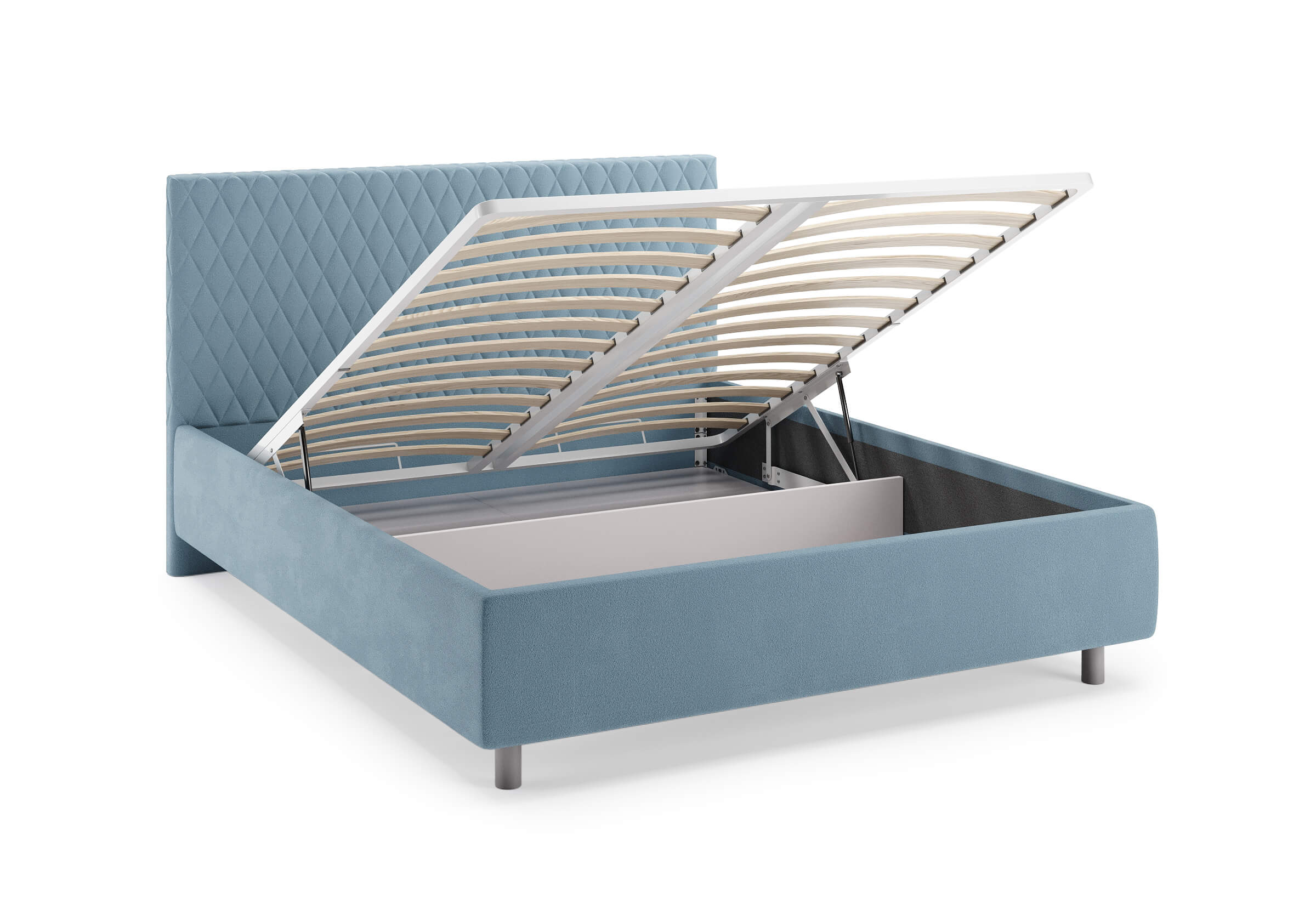 Прямую форму изголовья декорирует мягкий чехол. Чехол изголовья простеган ромбами среднего размера, что добавляет модели объем и подчеркивает выразительность. Кровать Stella лаконична, нейтральна, не берет на себя много внимания поэтому органично впишется в большинство современных интерьеров.  Увеличенный просвет от пола позволяет облегчить уборку под кроватью, в том числе роботом–пылесосом. Царги кровати выполняются по технологии съемного чехла. При необходимости кровать может быть укомплектована разборным или неразборным металлическим основанием с ламелями, подъемным механизмом с бельевым ящиком.