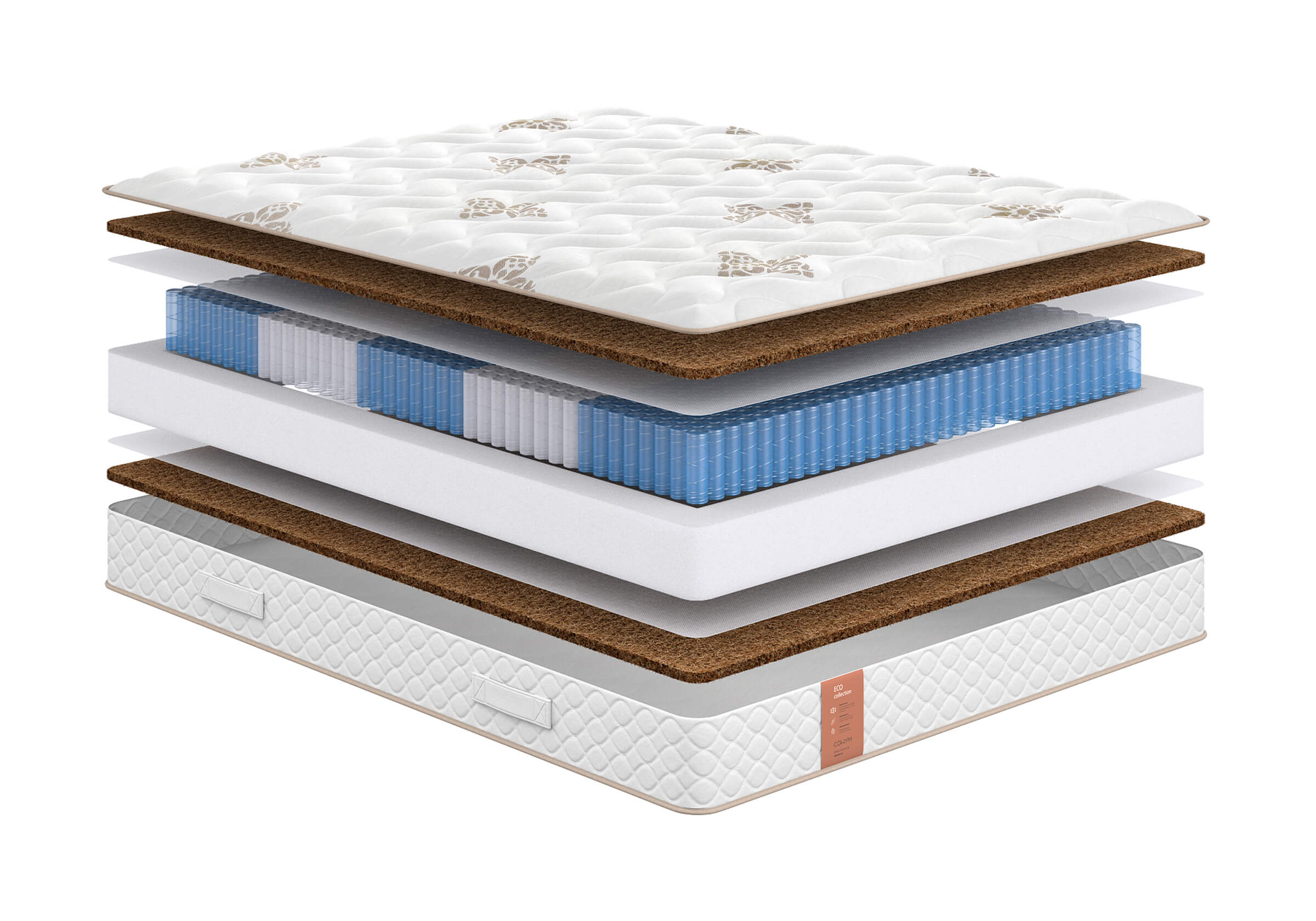 В основе матраса блок независимых пружин Pocket 5 Zone, имеющий 5 зон различной степени упругости, плотностью 512 пружин на спальное место. Благодаря использованию проволоки различного диаметра каждая из зон обеспечивает правильную поддержку позвоночника и правильное распределение нагрузки. В качестве наполнителя используется натуральная кокосовая койра. Матрас с кокосовой койрой самый жесткий в коллекции Eco.Чехол выполнен из приятного трикотажа с вискозой, простеганного на объемном гипоаллергенном синтепоне.