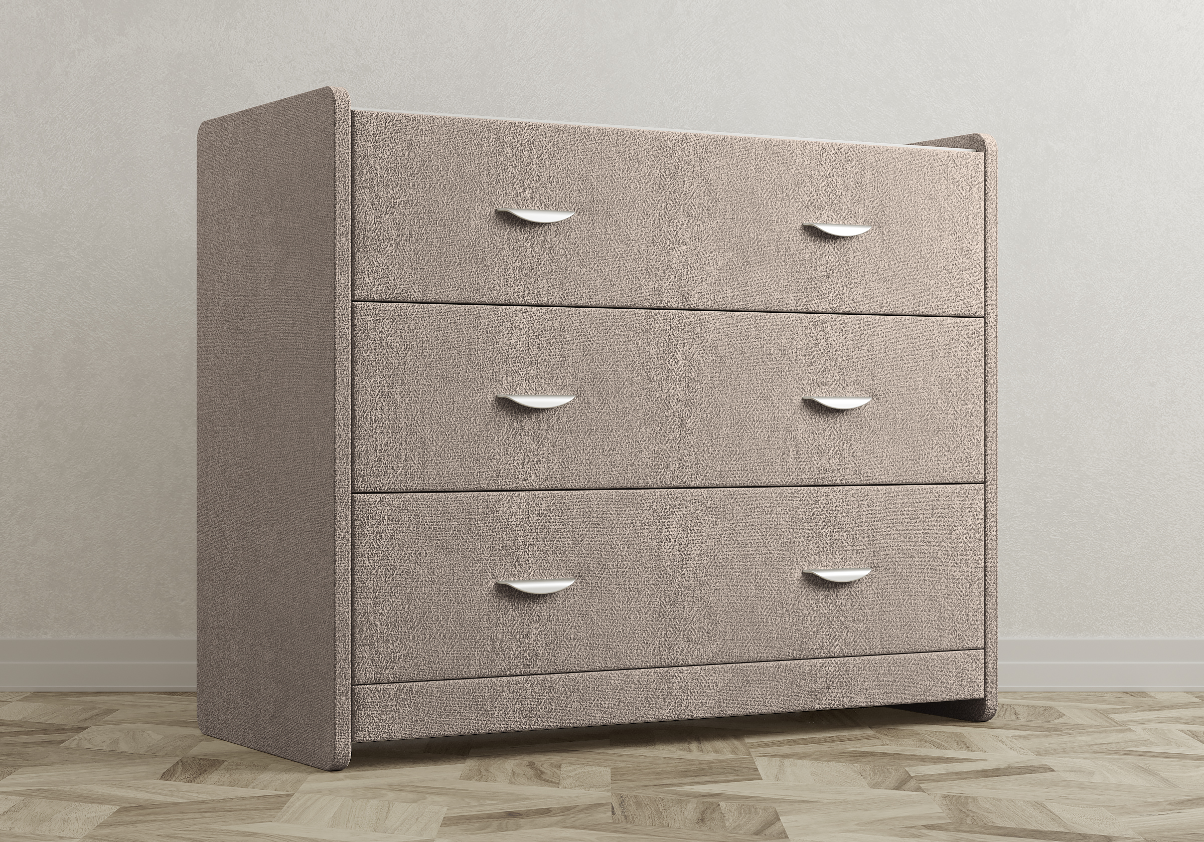 Современный и элегантный комод отличается повышенным удобством. Фасад ящиков и стенки комода покрыты обивочным материалом и выполняются в 43 вариантах цветового исполнения. Для удобства использования и продления срока эксплуатации, рекомендуется использовать стеклянную накладку. Накладка используется в качестве столешницы для тумбы и защищает ее от повреждений и загрязнений.