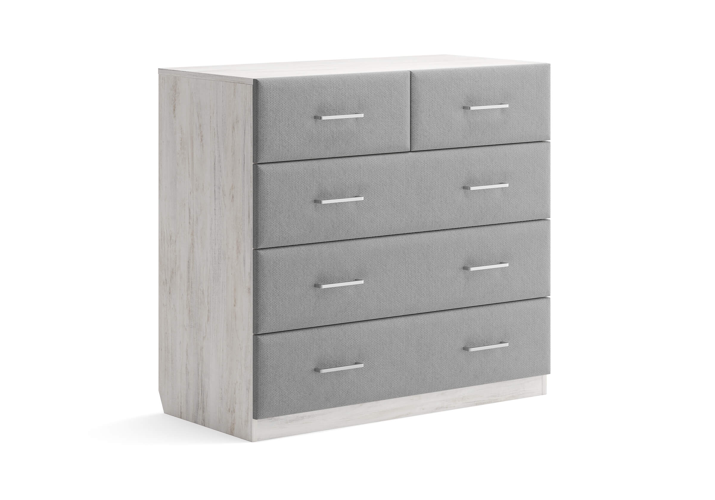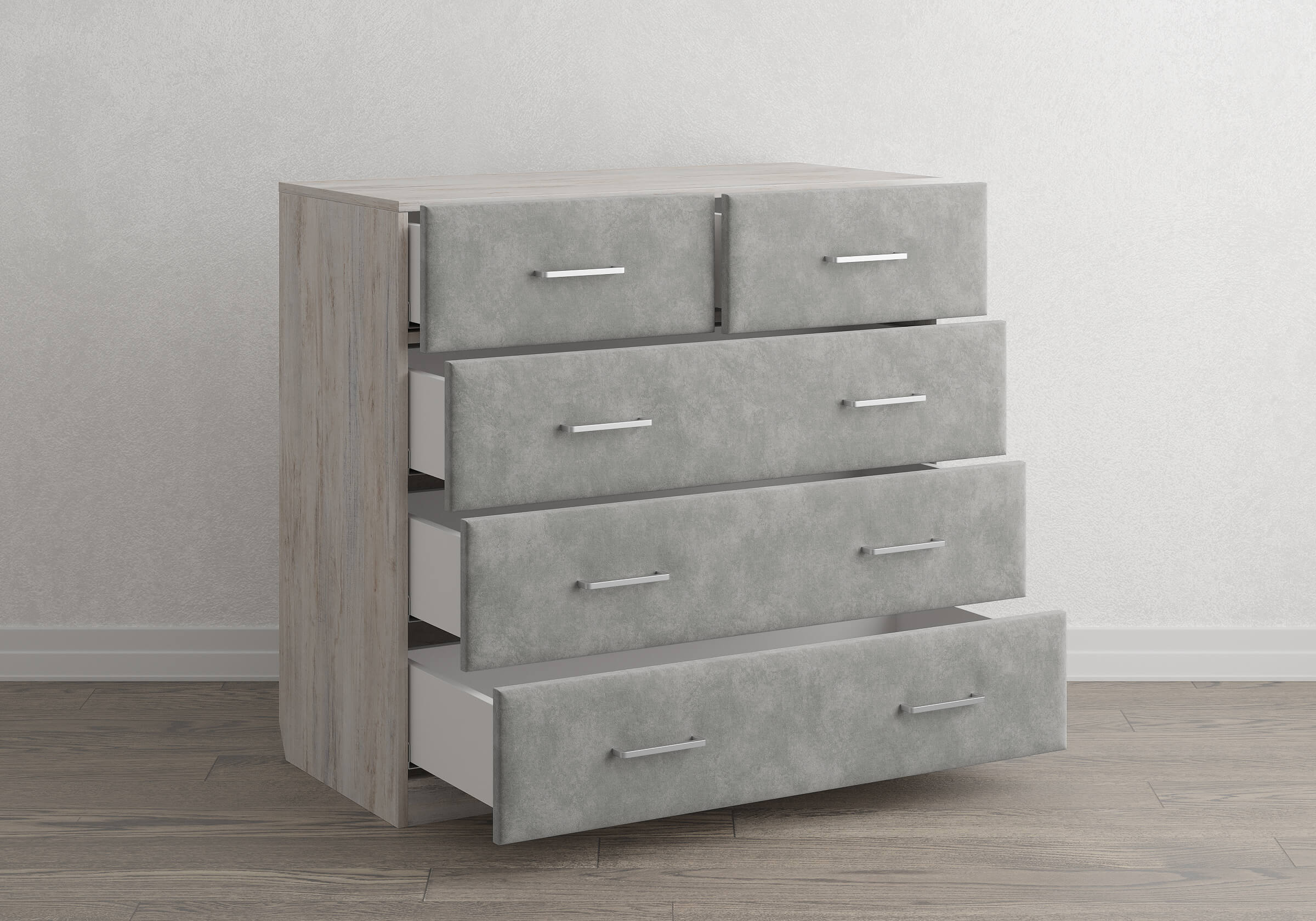 Комбинированный комод Tomas с пятью вместительными ящиками станет элегантным дополнением интерьера. Корпус, выполненный из высококачественной ЛДСП, гарантирует прочность и долговечность, а мягкие фасады в ткани и изящные металлические ручки добавят уют. Комод имеет скос под плинтус, это позволяет устанавливать его вплотную к стене. Благодаря своему дизайну и широкому выбору вариантов исполнения комод можно разместить не только в спальне, но и в прихожей или гостиной.