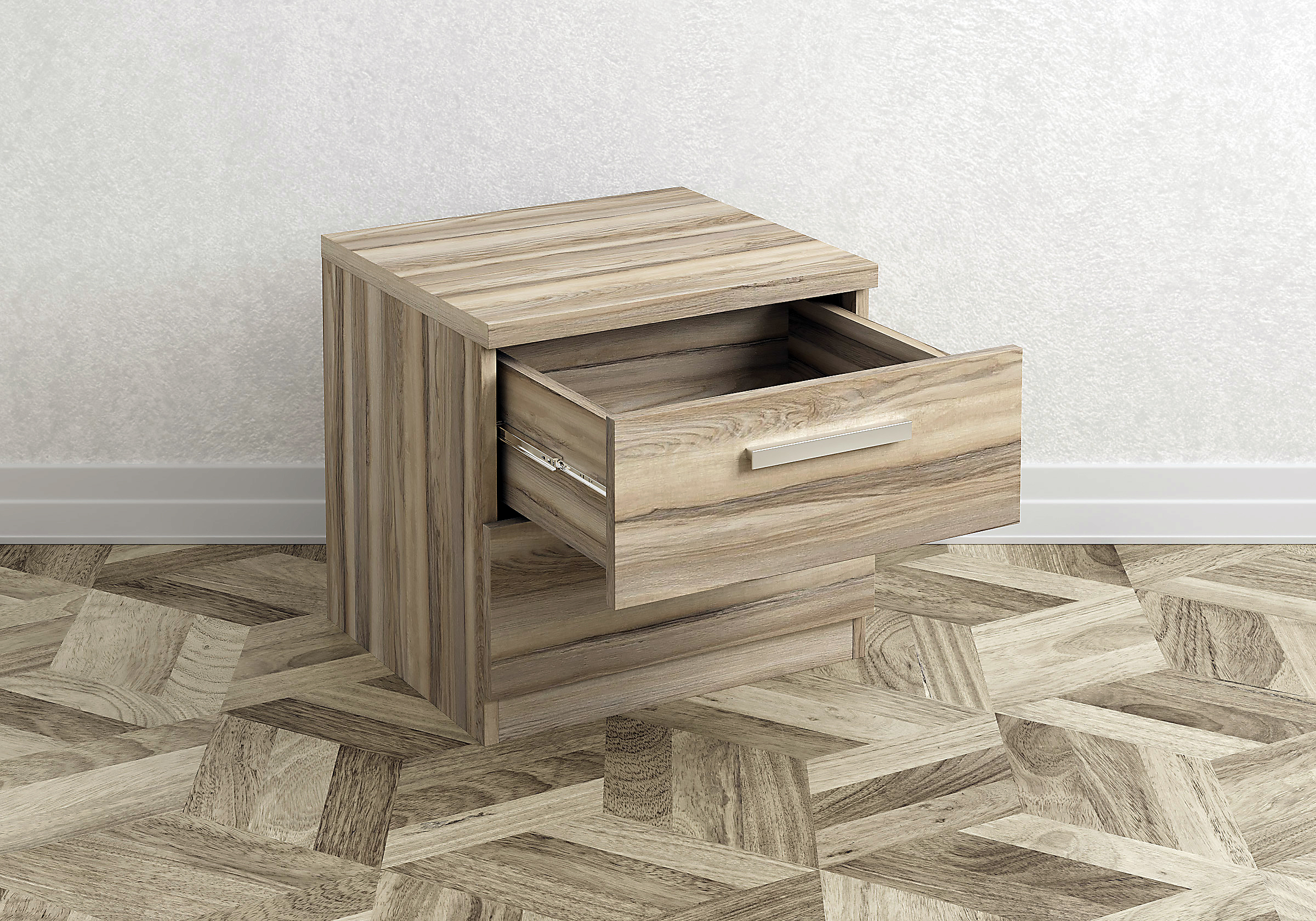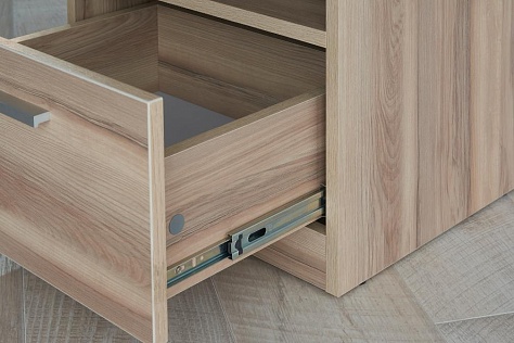 Шариковые направляющие позволяют легко выдвигать ящик, а металлические ручки придают строгость.