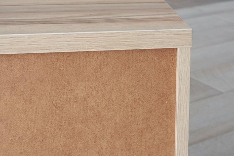 Задняя стенка тумбы вставлена в пазы боковых стенок и столешницы, что придает жесткость конструкции и выглядит эстетично.