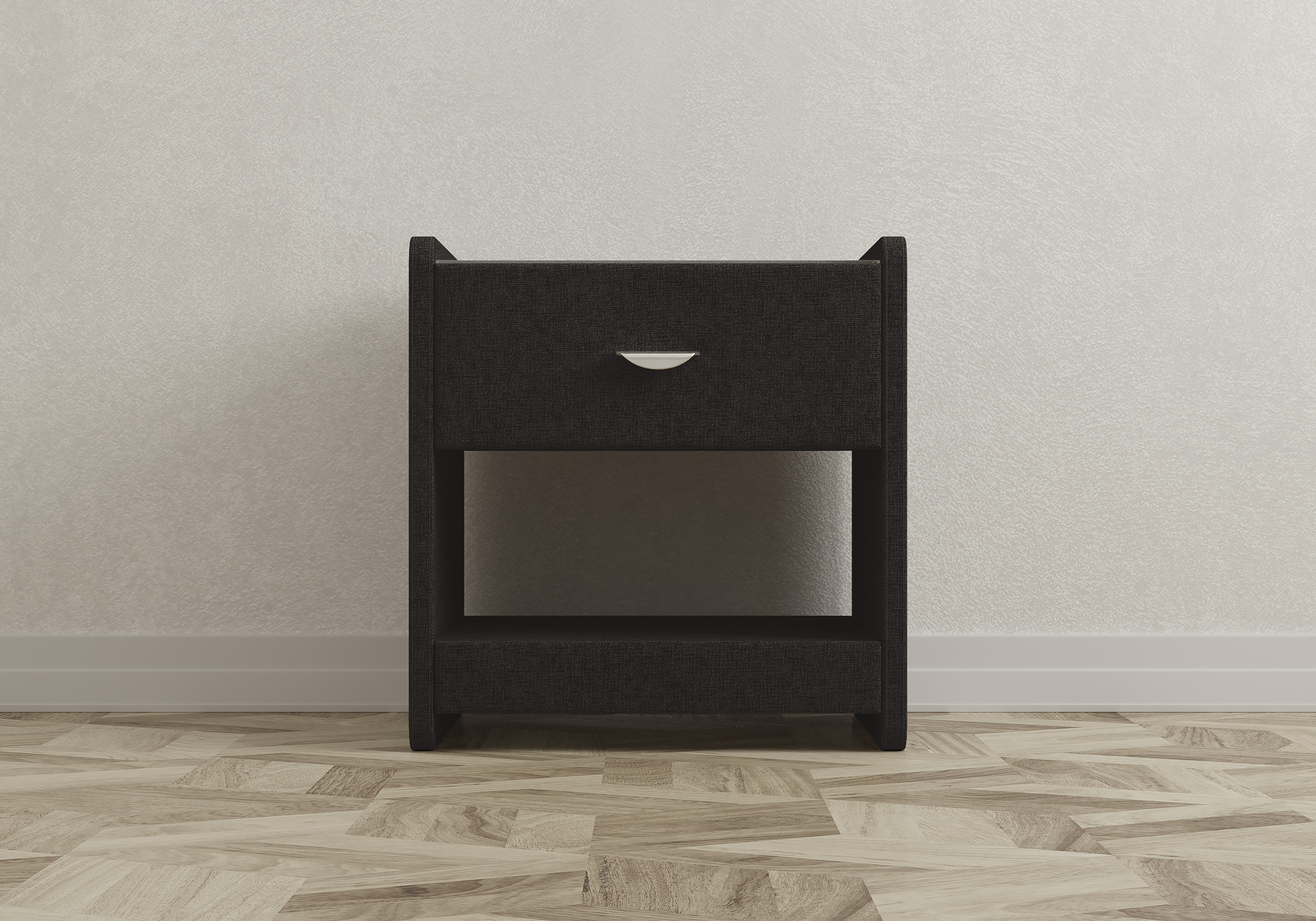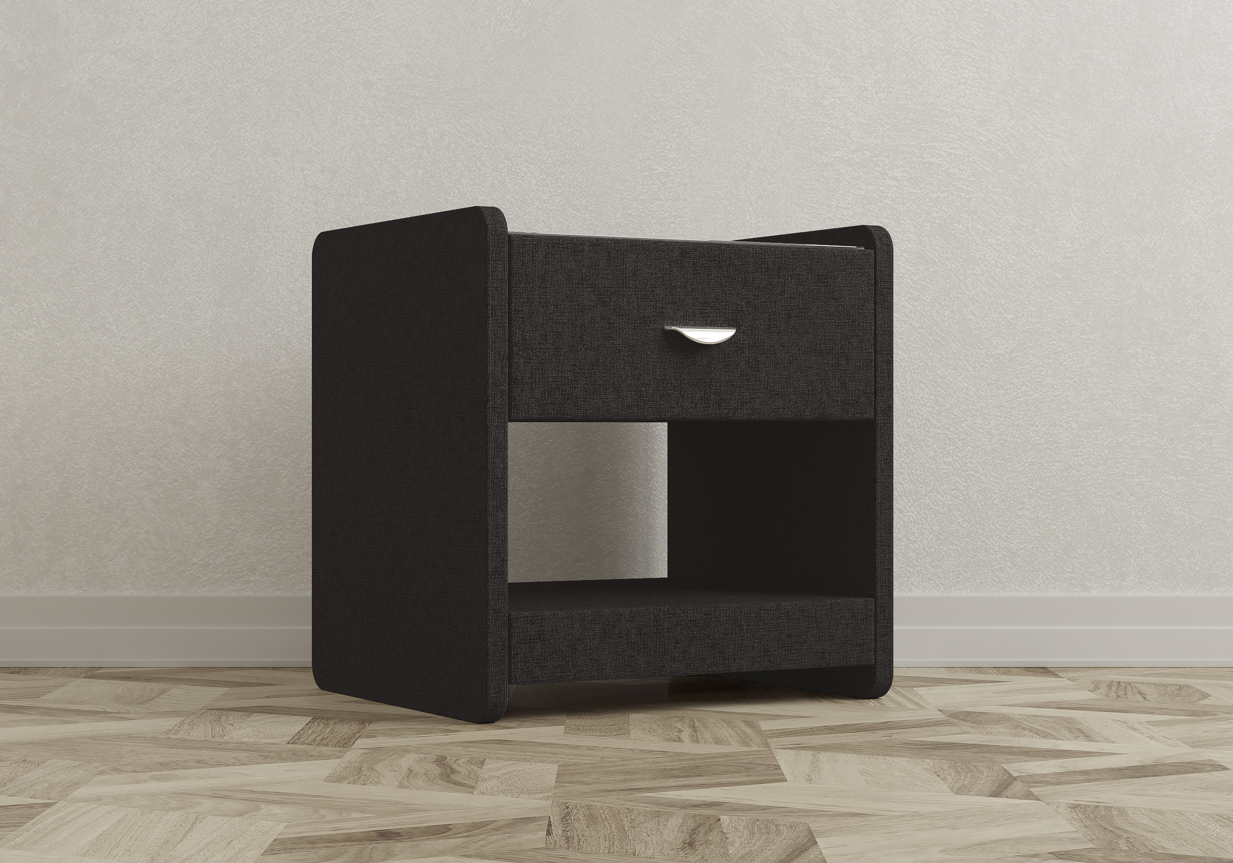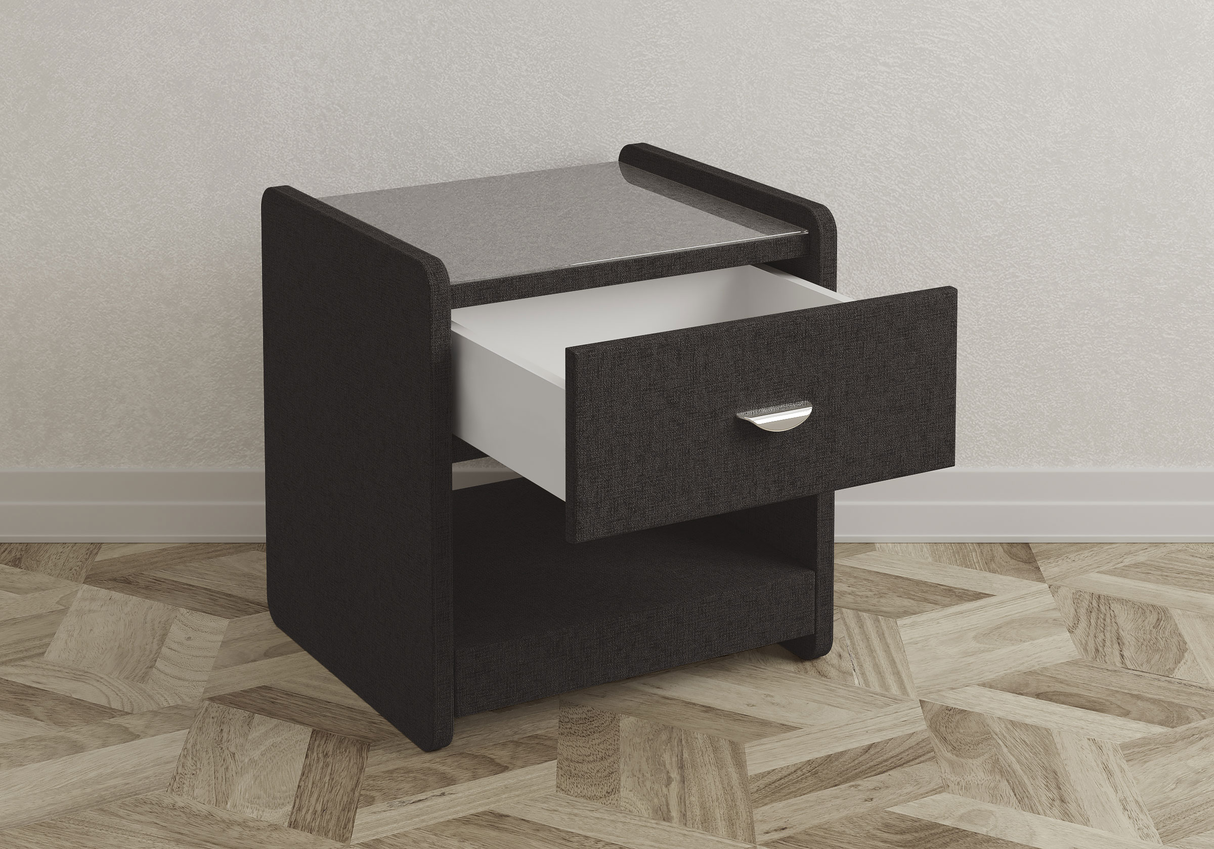 Стильная и практичная тумбочка. Ящик вместительные, кладу туда очки, книжки. Размер стандартный, удобный - 51-44-52 см. Удобная ручка на выдвижном ящике, качественная фурнитура, не скрипит при открывании. Сначала я сомневалась, брать ли тканевые тумбочки – казалось, пачкаться будут и пыль собирать. Но это не так, продавец в магазине сразу сказала заказать жидкое стекло наверх. Пятна на ней незаметны, пыли тоже нет особенно, но я на всякий случай обрабатываю пылесосом.