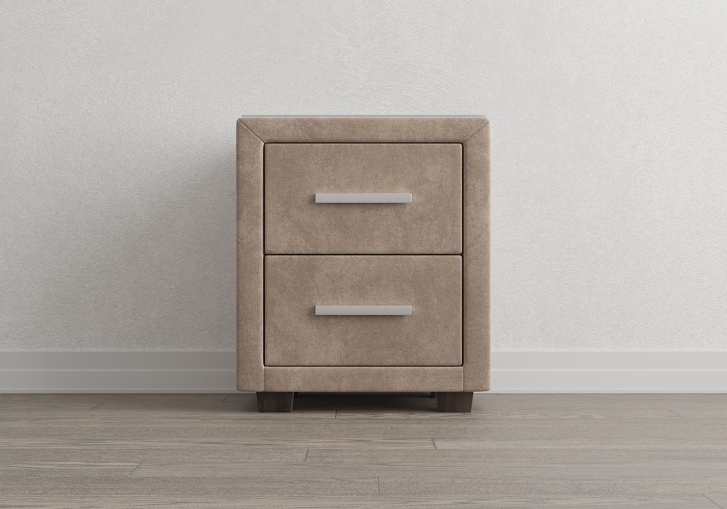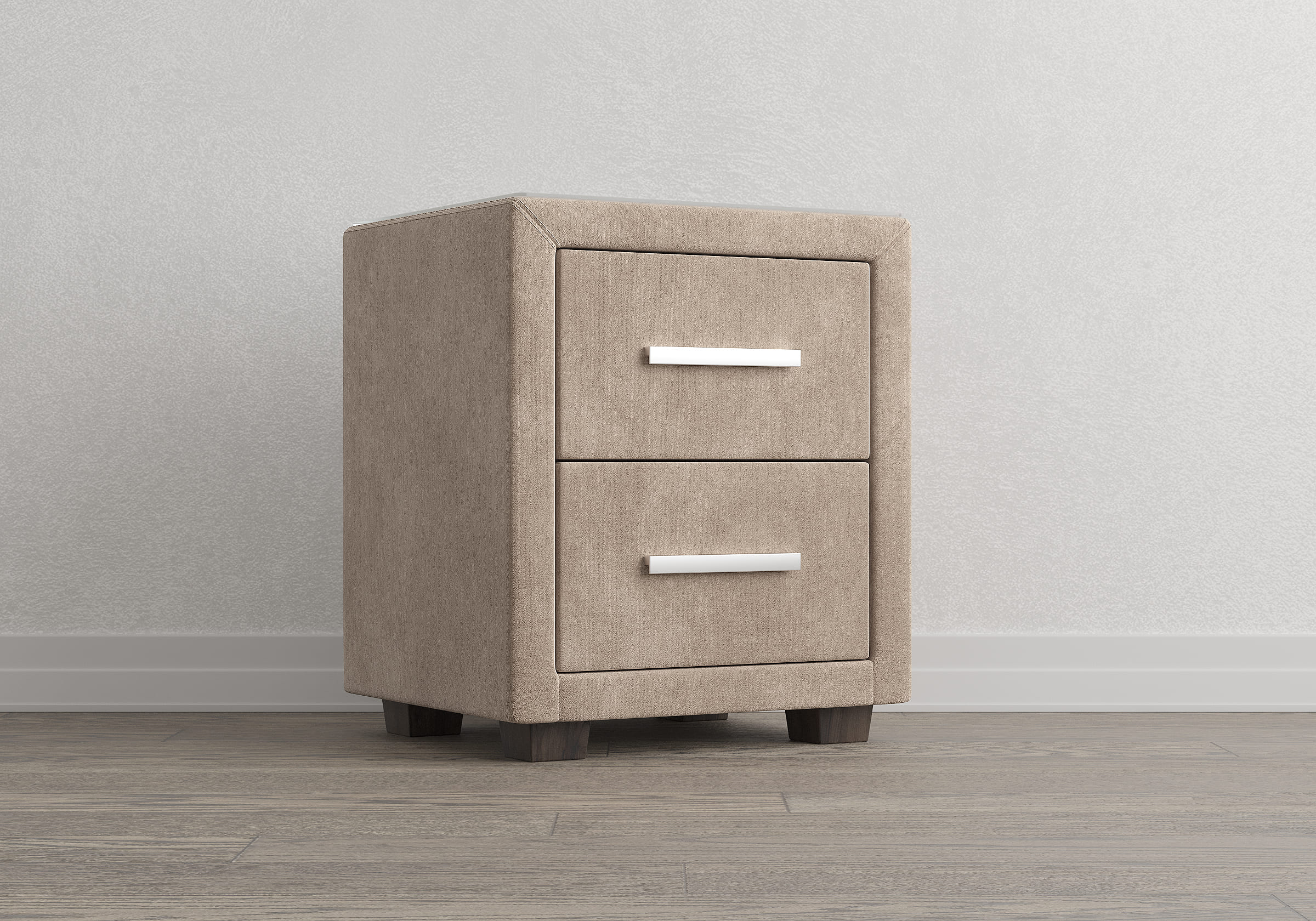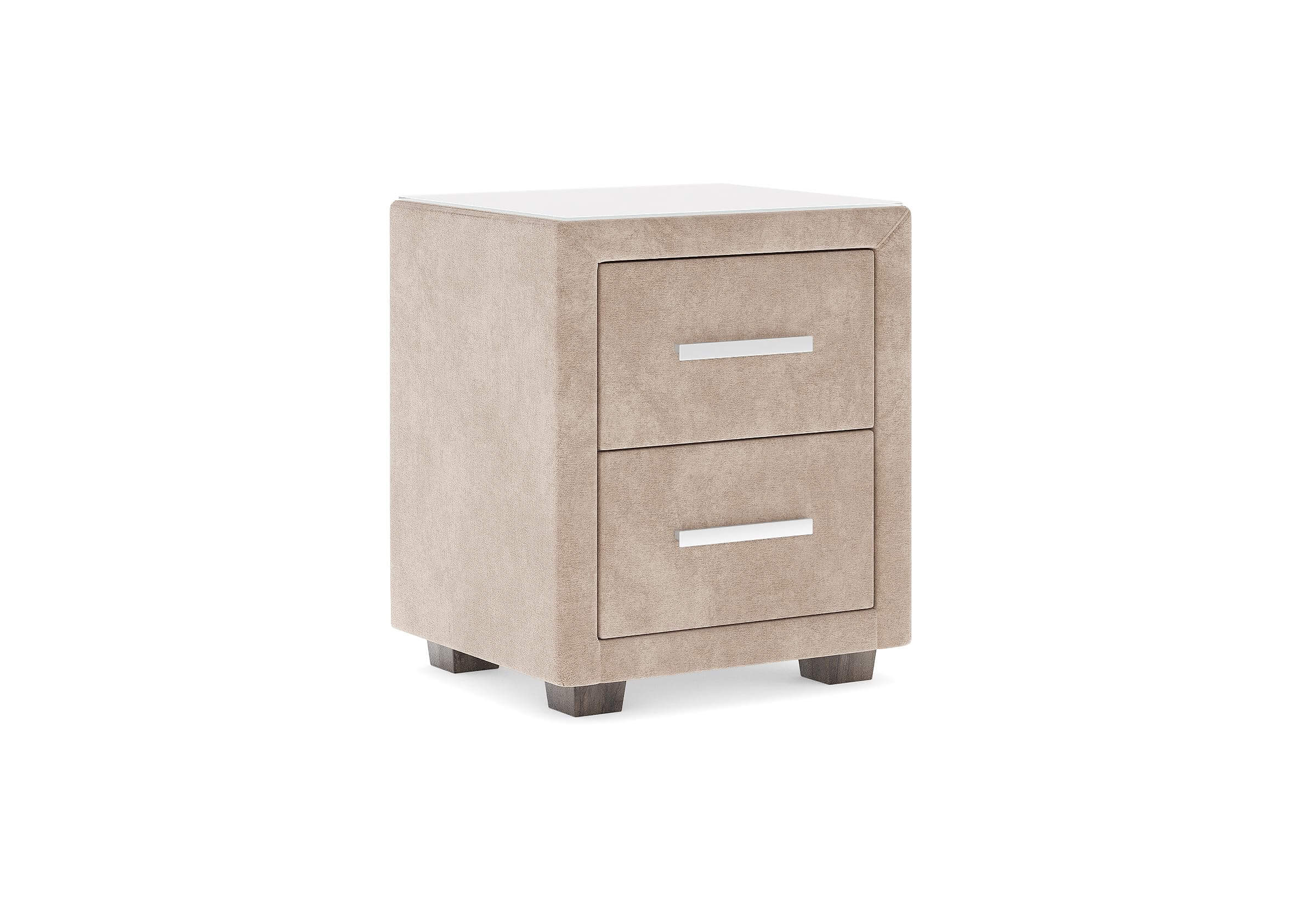 Прикроватная тумба с двумя выдвижными ящиками сочетается с любыми моделями кроватей, органично вписывается в интерьер практически любого стиля. Каркас тумбы выполнен из ДСП. Каркас тумбы и фасад ящиков покрыты обивочным материалом.  Для удобства использования и продления срока эксплуатации, рекомендуется использовать стеклянную накладку. Накладка используется в качестве столешницы для тумбы и защищает ее от повреждений и загрязнений