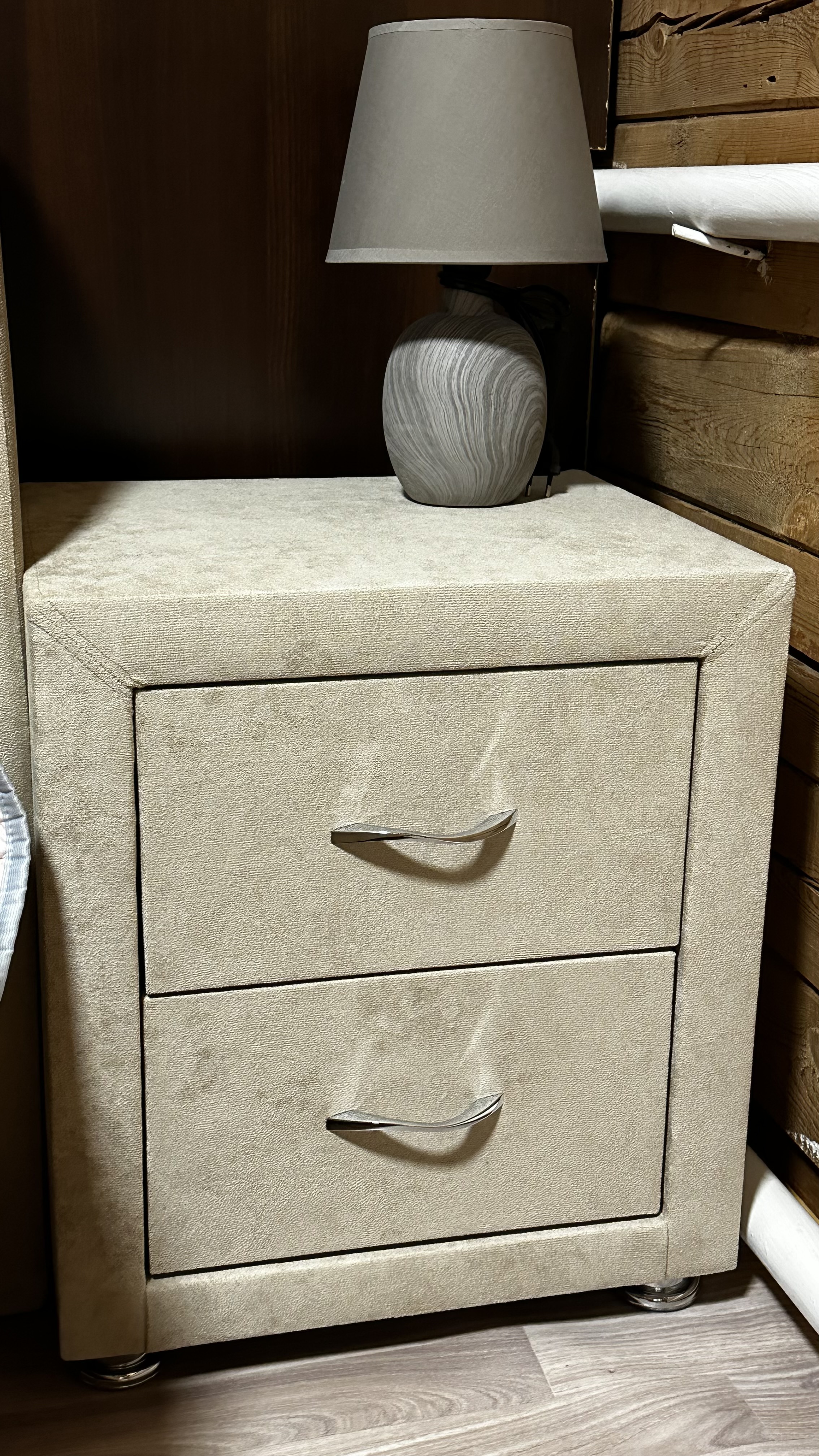 Очень интересная по дизайну тумбочка – фигурные ручки, тканевая обивка, основательные, стильные ножки из блестящего металла. Мы заказали из серой замши, под кровать, друг другу они подошли идеально. Два ящика, выдвигаются легко и бесшумно. Рекомендую.