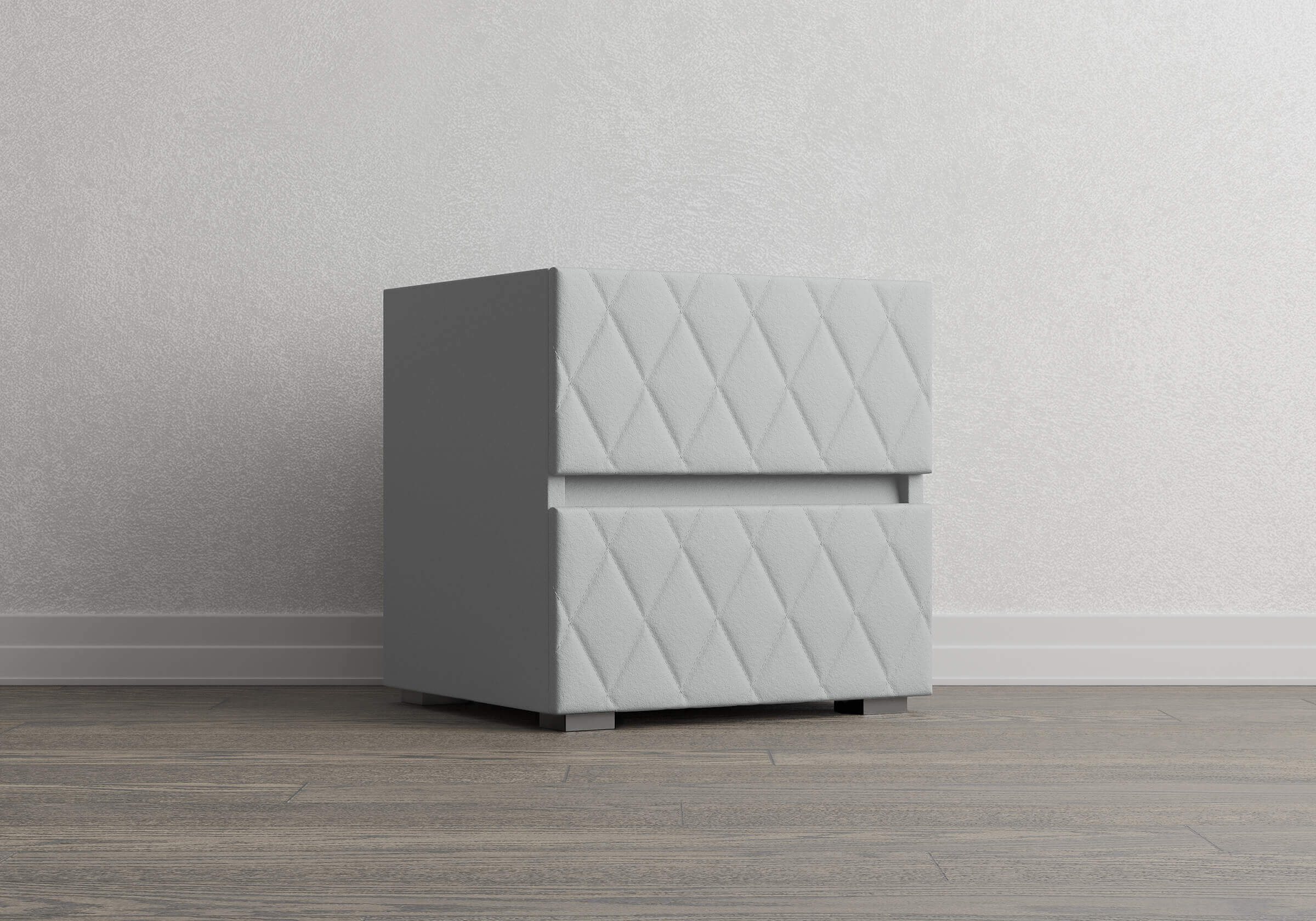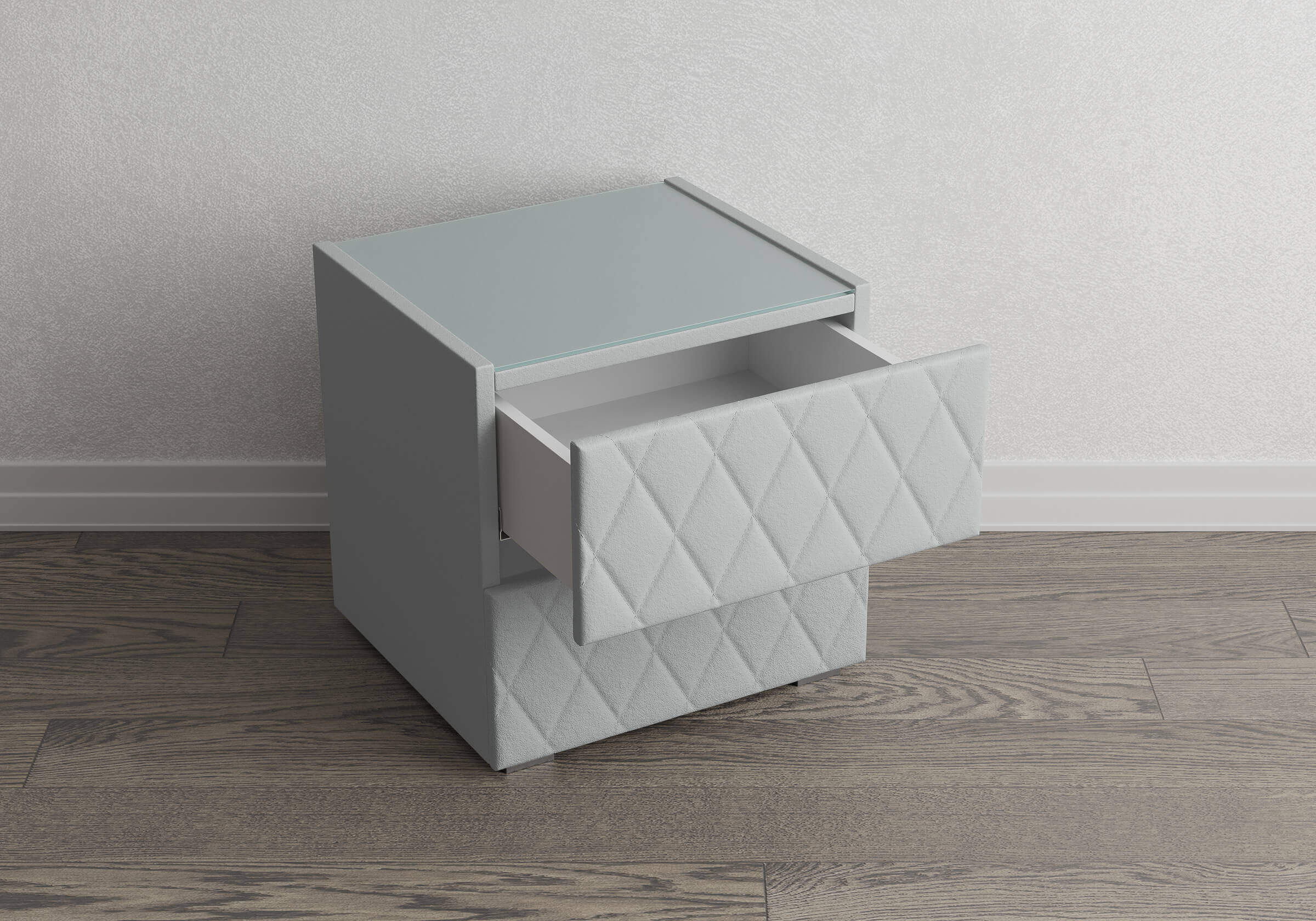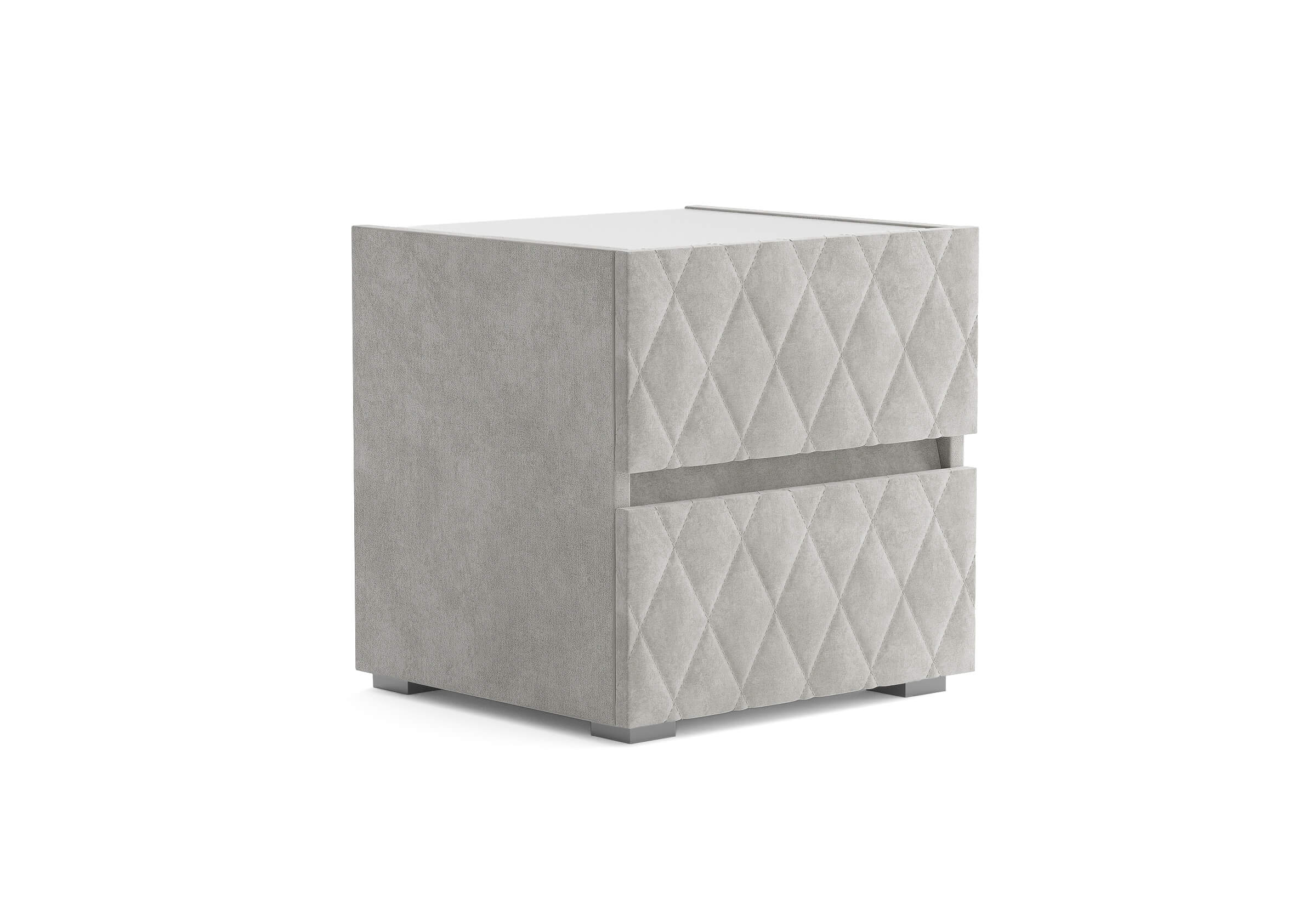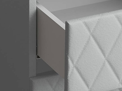 Тумба с мягкими фасадами, украшенными изысканной стежкой в виде ромбов, представляет собой идеальное сочетание утонченного дизайна и функциональности. Два выдвижных ящика с направляющими скрытого монтажа оснащены доводчиками. Тумбу дополнительно можно укомплектовать стеклянной столешницей. Широкий выбор фактур и цветов исполнения.
