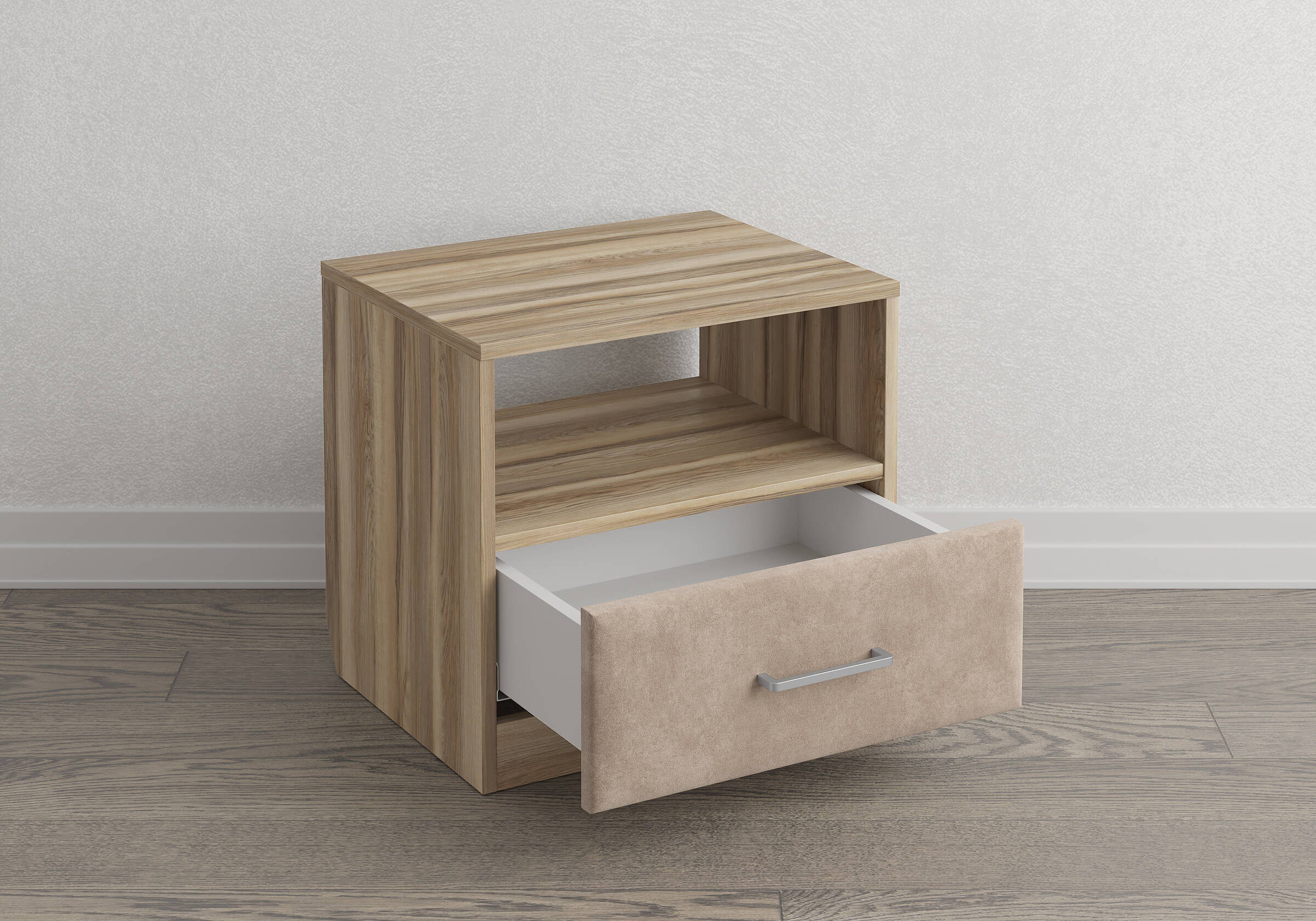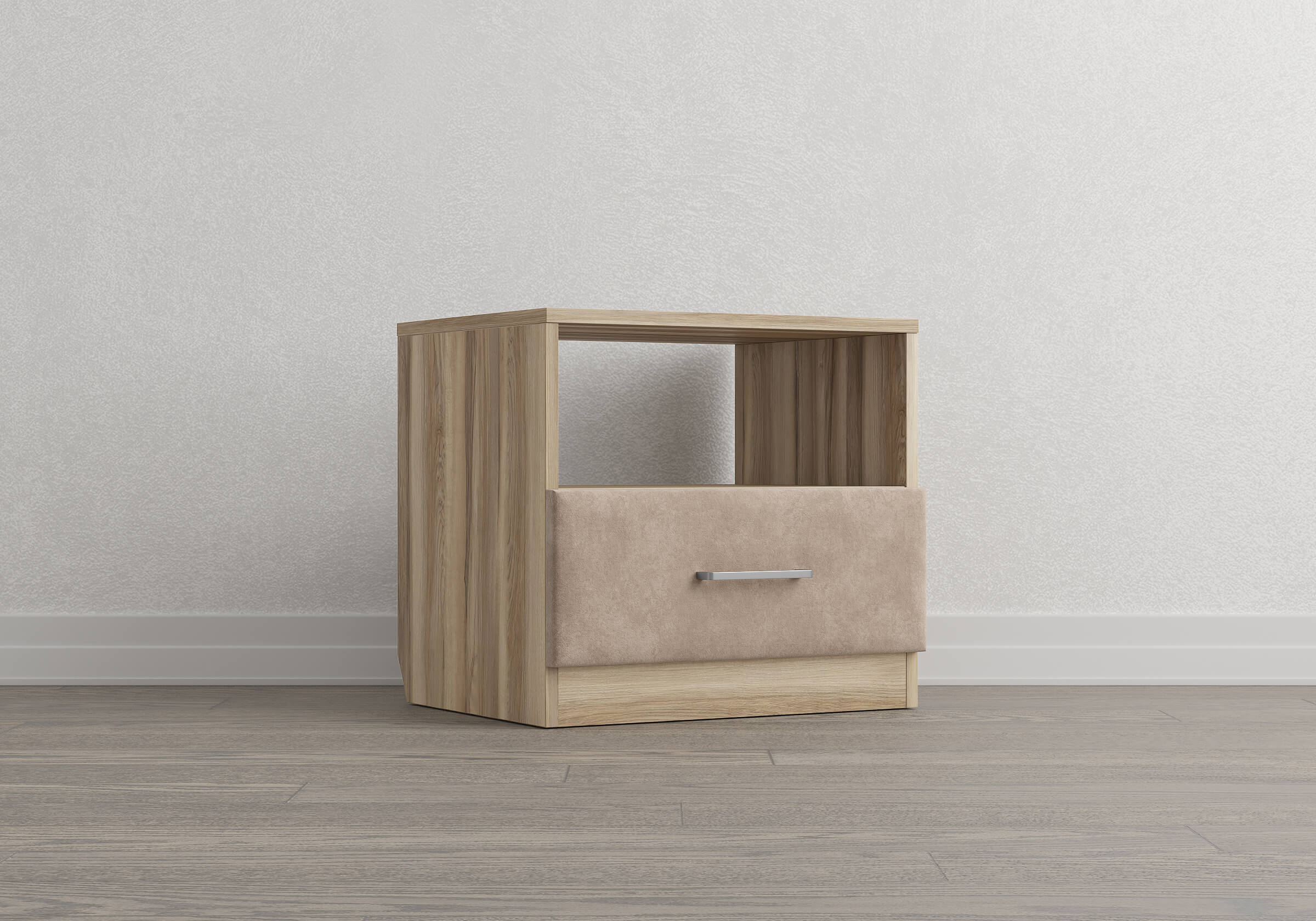Элегантная комбинированная тумба, сочетающая в себе лаконичность ЛДСП и уют мягких фасадов ящиков, обтянутых тканью. Конструкция тумбы предусматривает открытую нишу для мелочей и вместительный выдвижной ящик с направляющими скрытого монтажа и доводчиками. Корпус из ЛДСП гарантирует долговечность и устойчивость к механическим повреждениям, а мягкие фасады в ткани и изящные металлические ручки добавят уют. Большое разнообразие текстур и цветовых решений для гармоничной интеграции в любой интерьер.