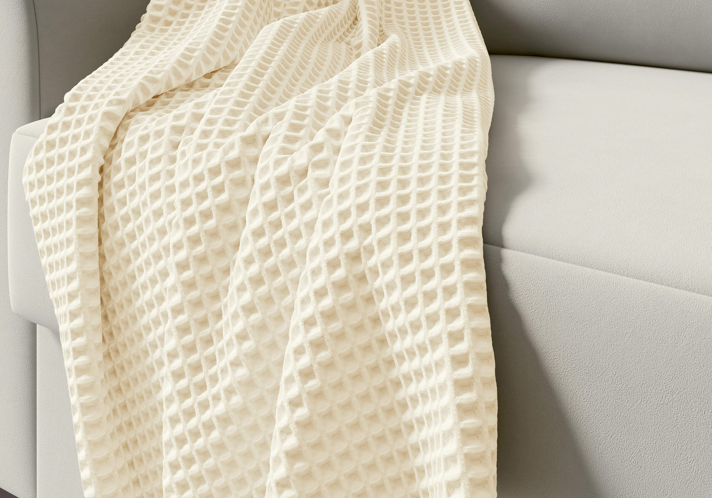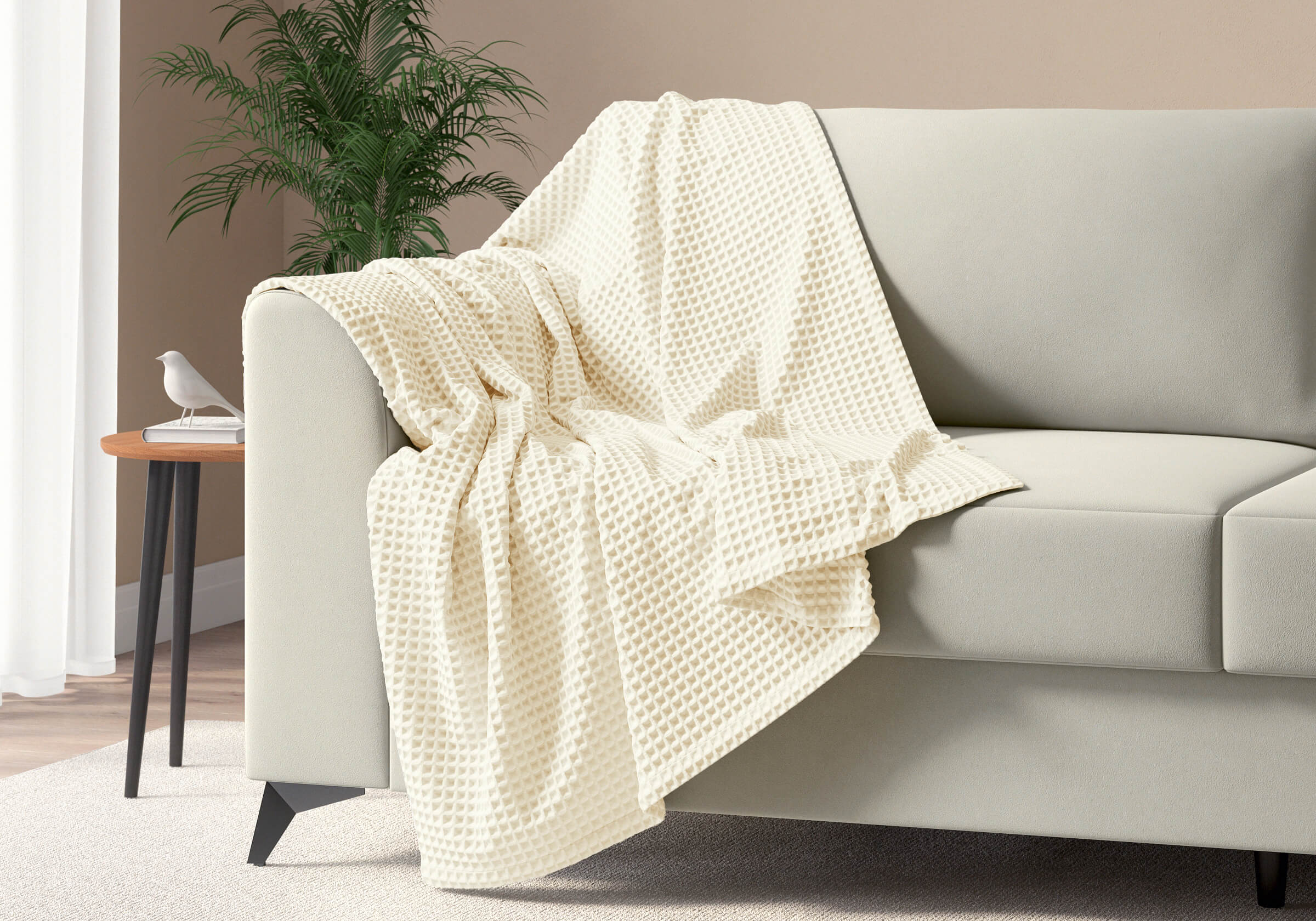 Плед Marko - мягкий вафельный плед, изготовлен из 100% натурального хлопка, который обладает хорошей воздухопроницаемостью. Глубокая рельефная ткань выглядит стильно и идеально вписывается в интерьер — будь то спальня в стиле минимализм, гостиная в скандинавском духе или уютный уголок с креслом и книжной полкой. Плед дарит ежедневное ощущение комфорта и теплой заботы благодаря хорошей плотности ткани, которая останется с вами на долго.